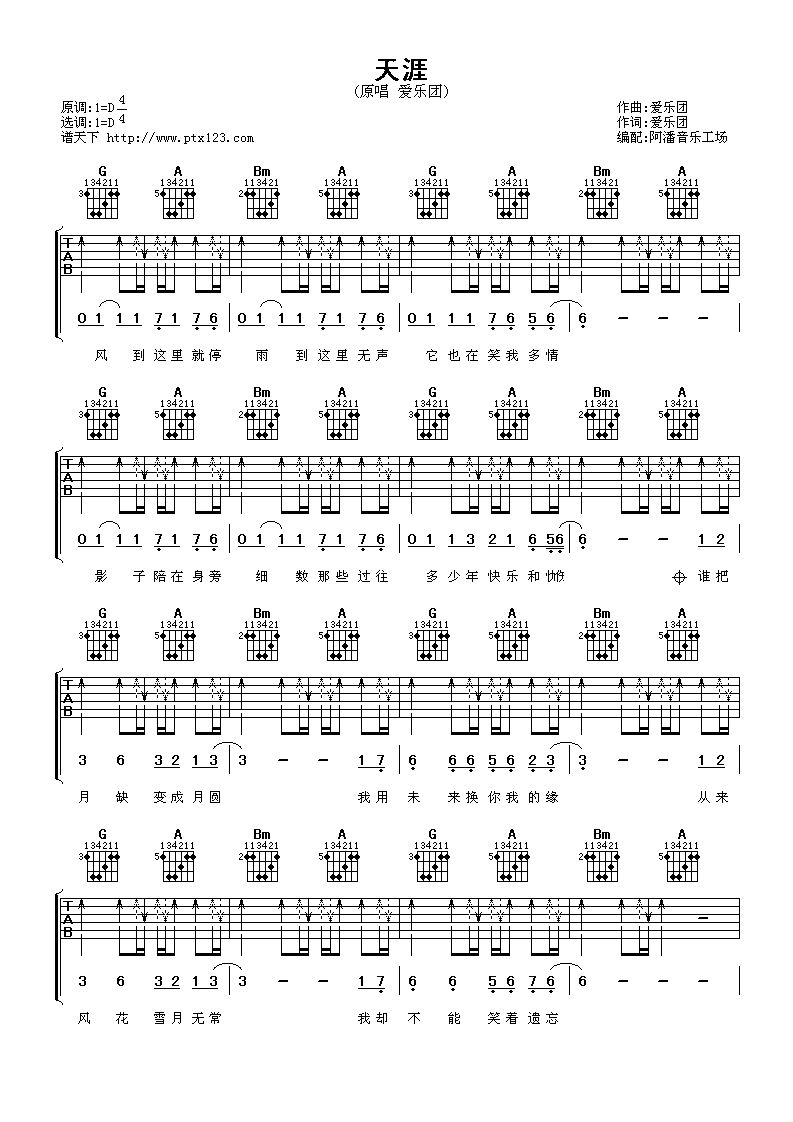 曲谱介绍: 爱乐团《天涯》吉他弹唱谱,采用D调指法编配,啊潘音乐工厂编配出品,共有5张高清图谱。