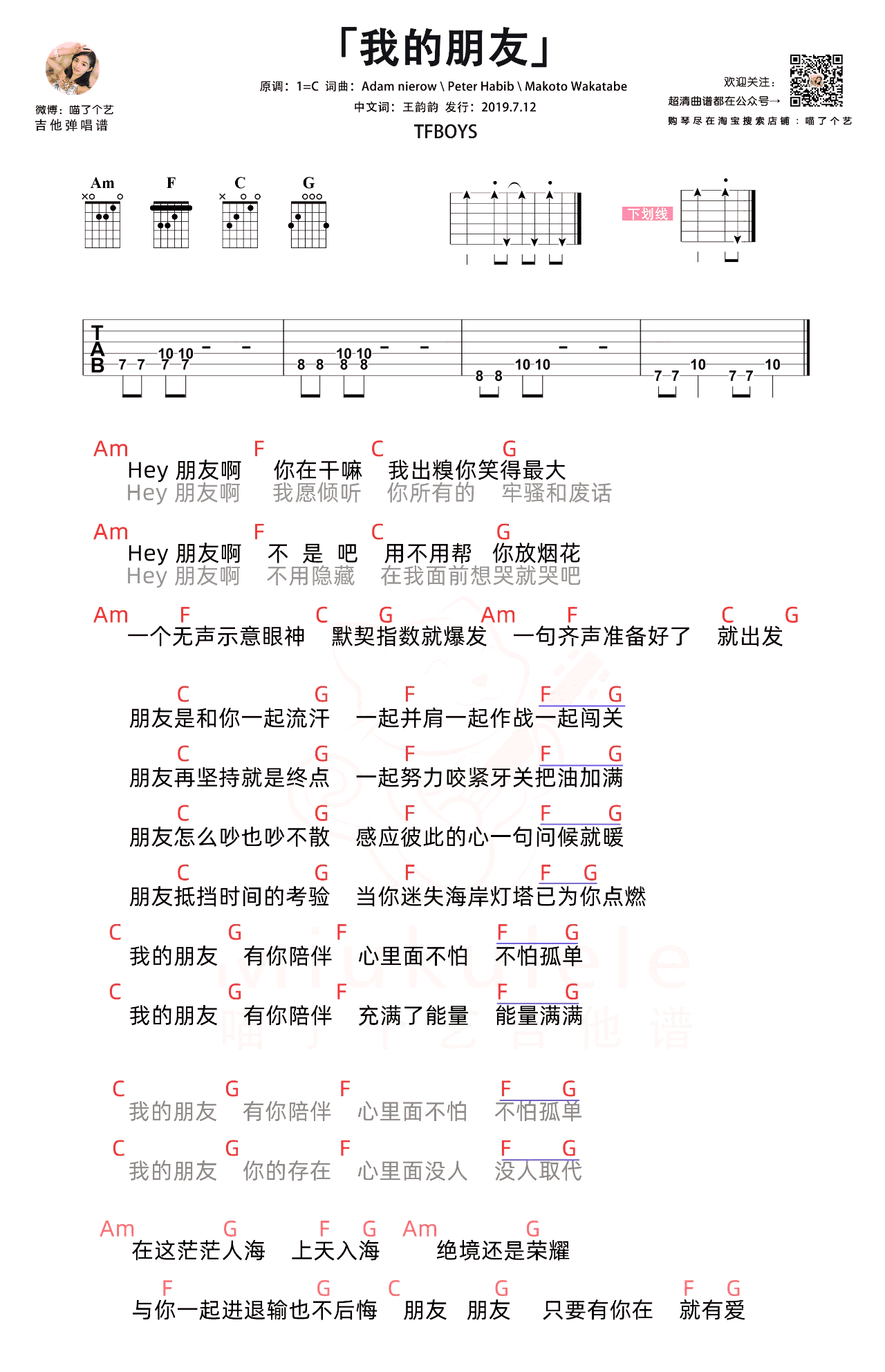 曲谱介绍: Tfboys《我的朋友》吉他弹唱谱,采用C调指法编配,喵了个艺编配出品,共有1张高清图谱,免翻页排版设计。