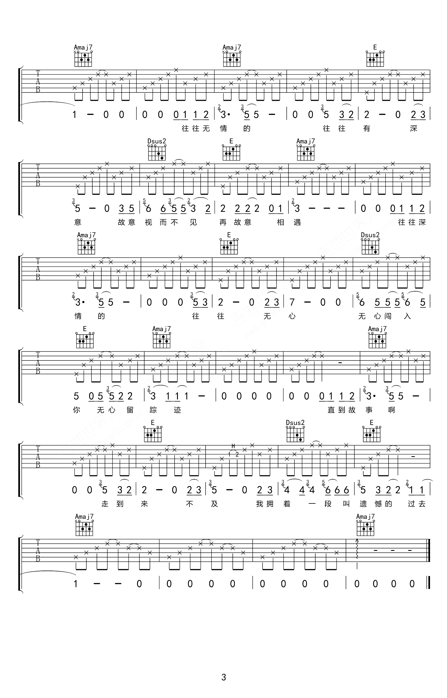 曲谱介绍: 房东的猫《往往》吉他弹唱谱,采用A调指法编配,共有3张高清图谱。