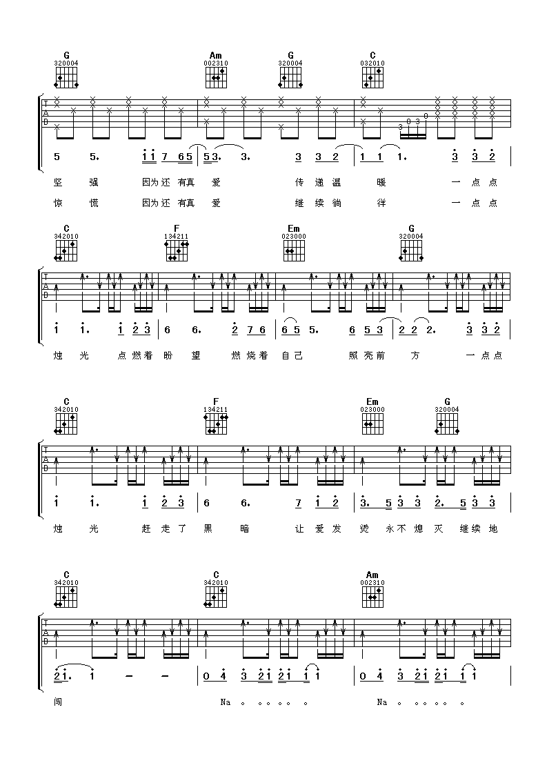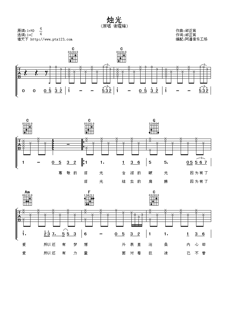 曲谱介绍: 谢霆锋《烛光》吉他弹唱谱,采用C调指法编配,阿潘音乐工厂编配出品,共有3张高清图谱。