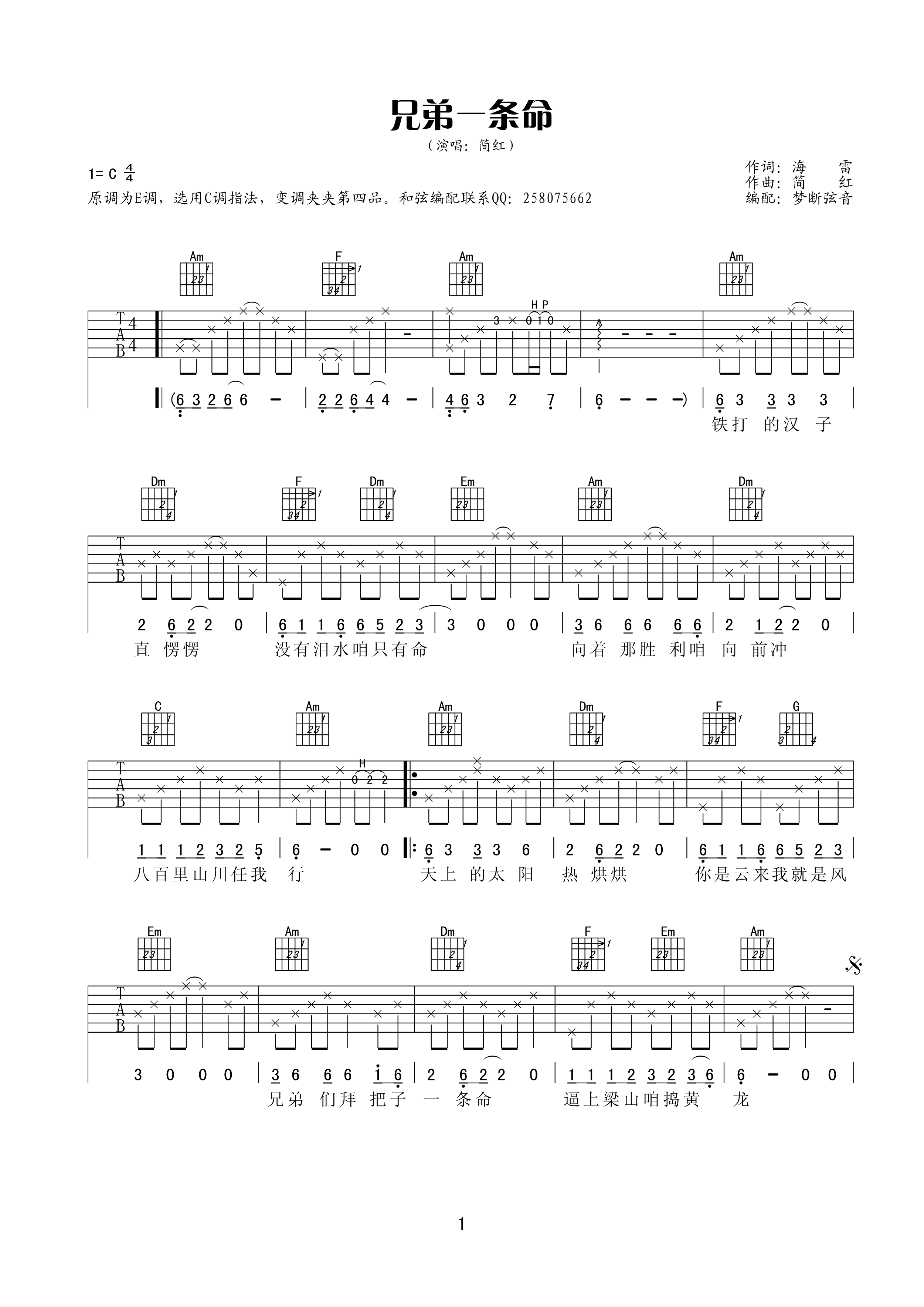 曲谱介绍: 简红《兄弟命一条》吉他弹唱谱,采用C调指法编配,梦断弦音编配出品,共有3张高清图谱。
