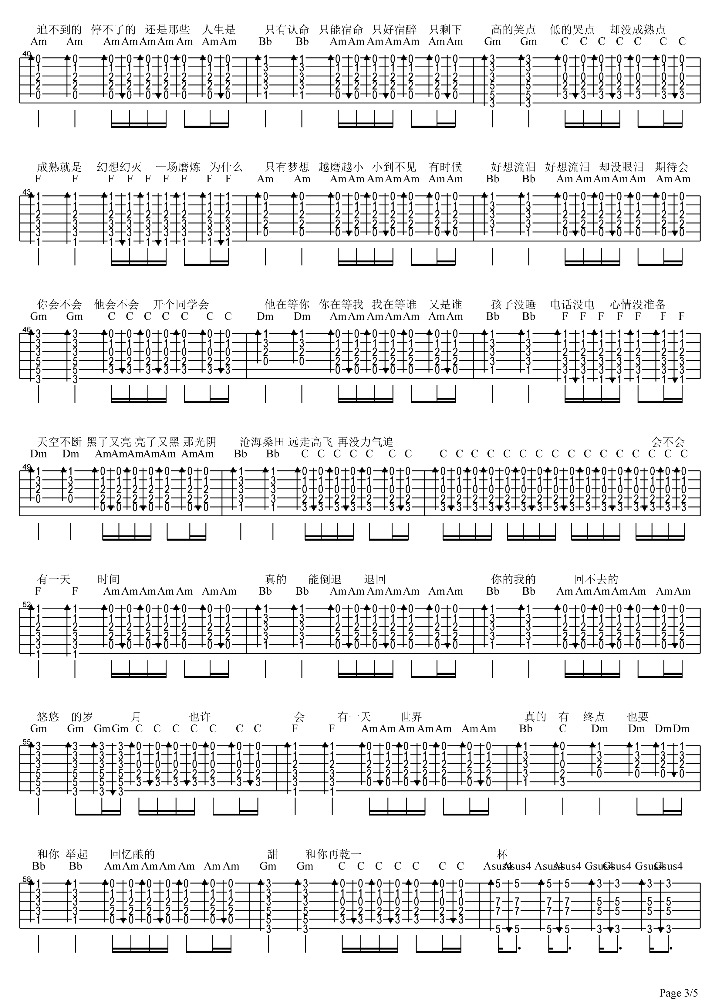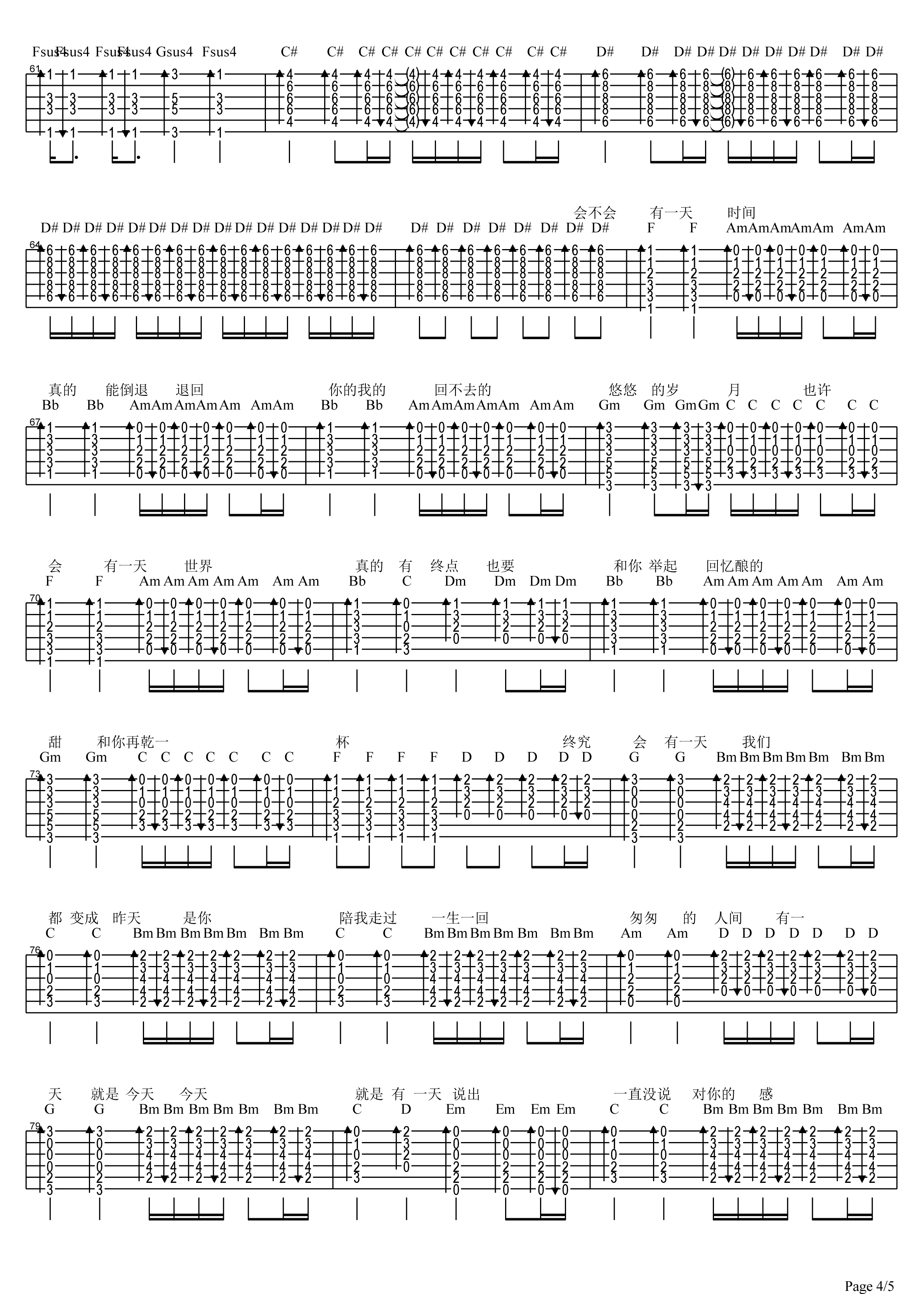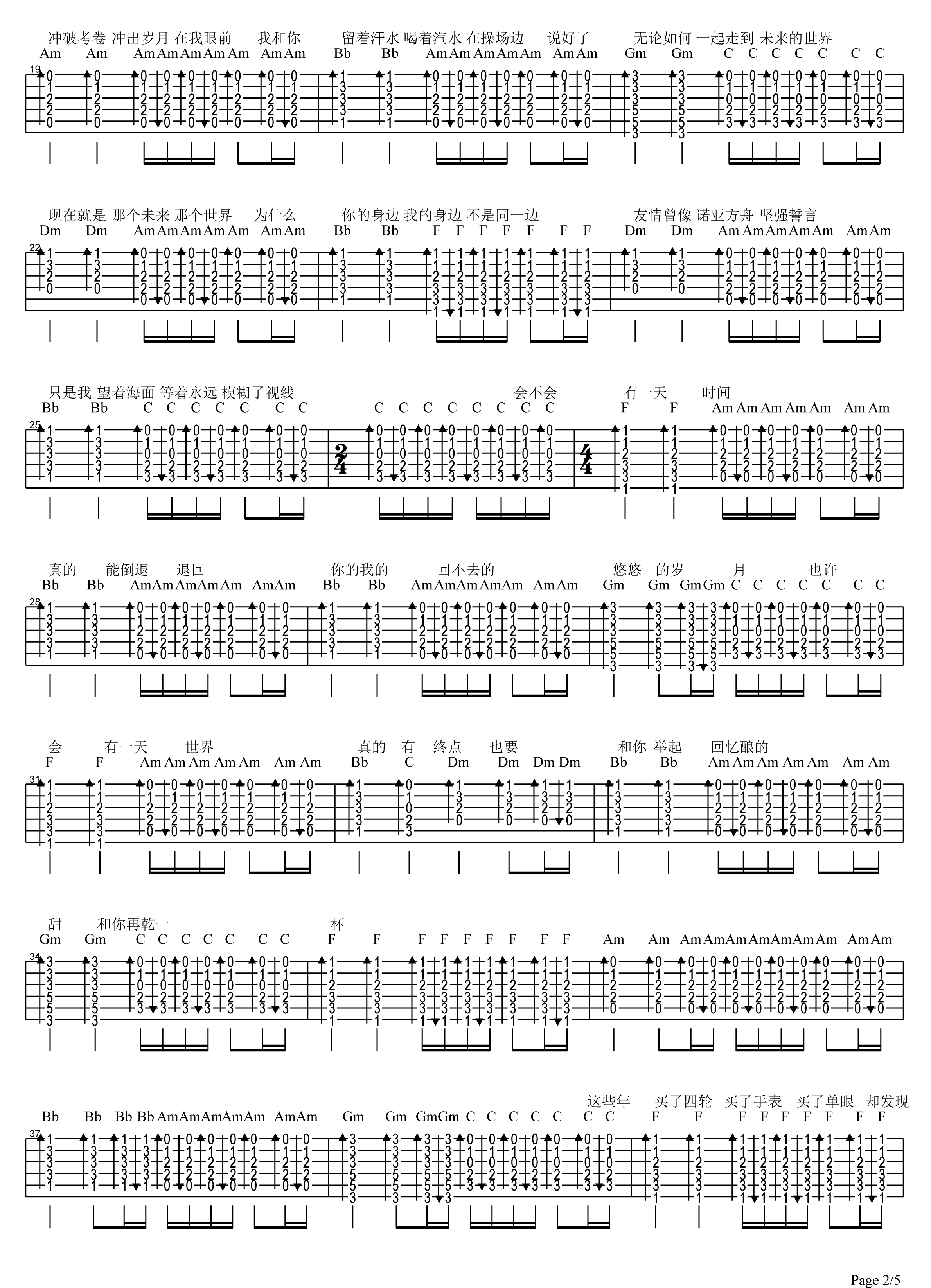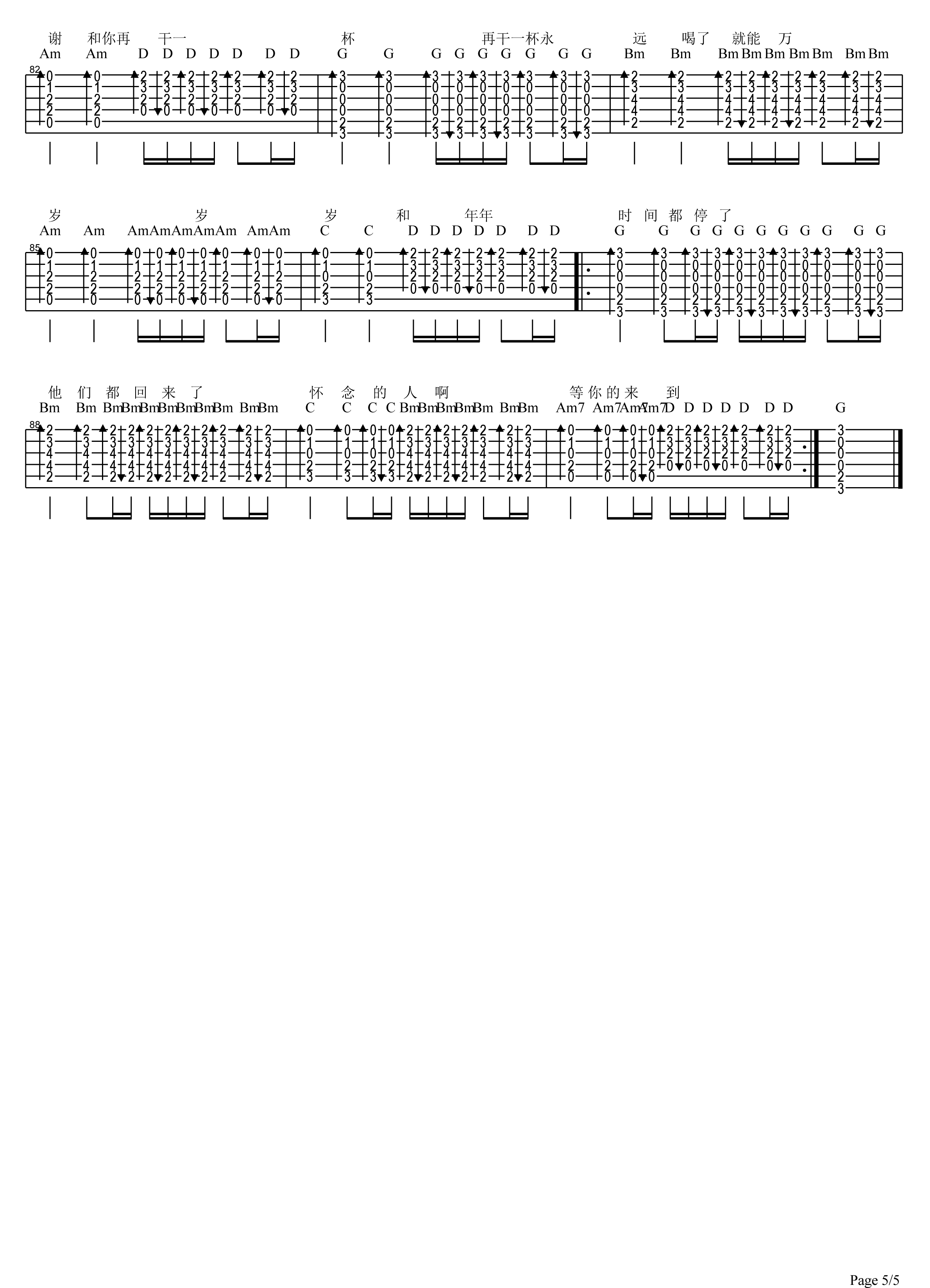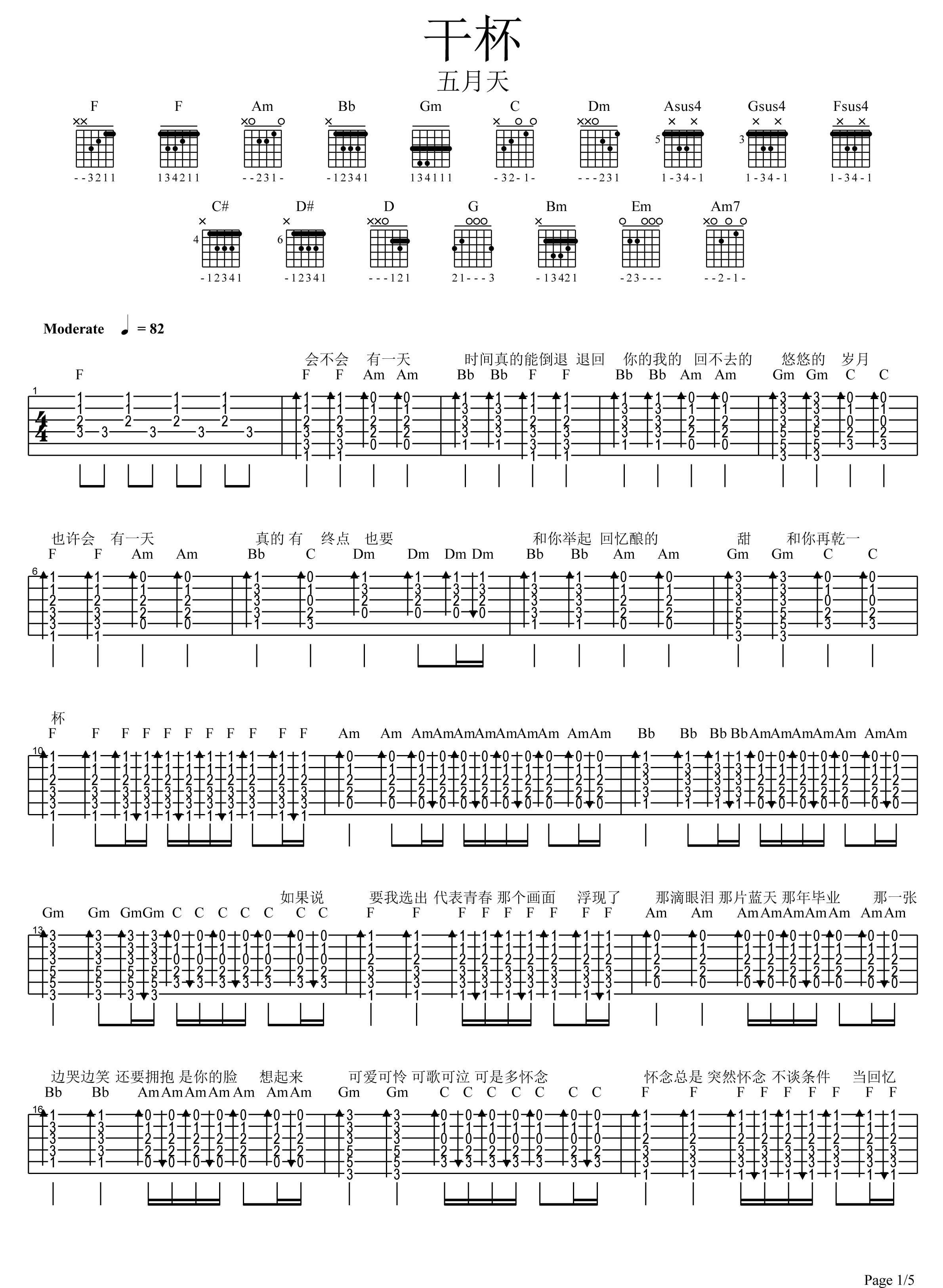 曲谱介绍: 五月天《干杯》吉他弹唱谱,采用C调指法编配,共有5张高清图谱。
