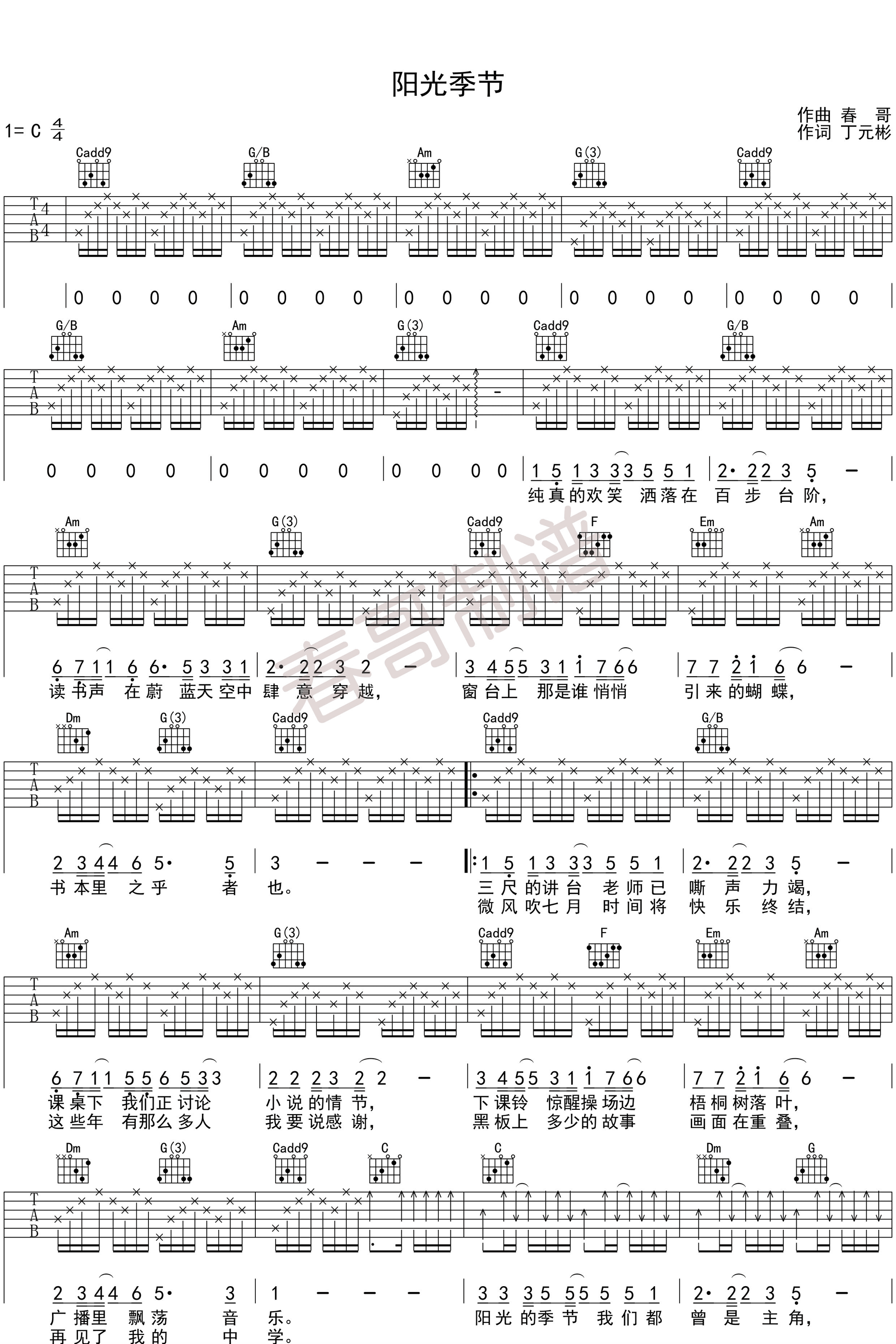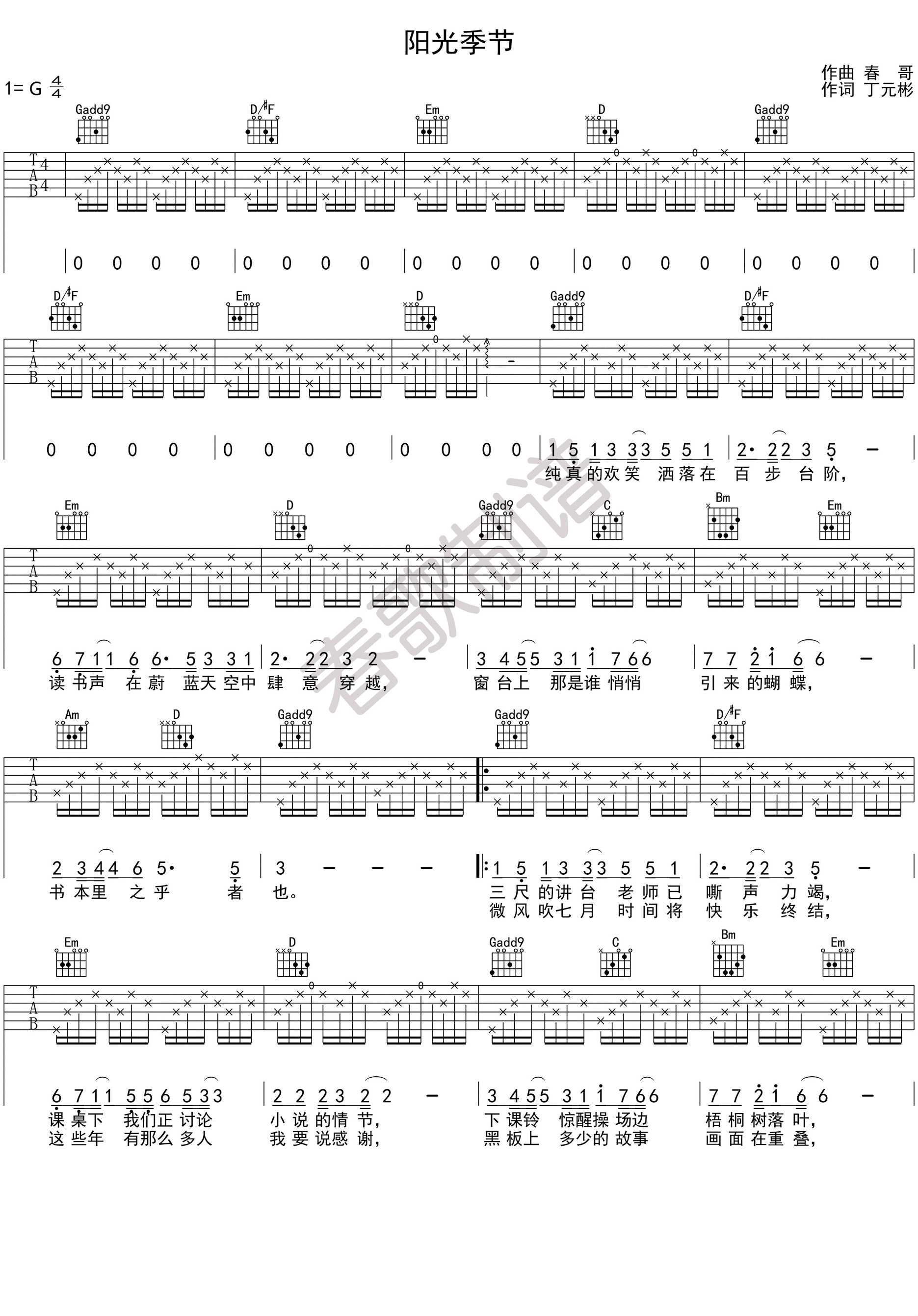 曲谱介绍: 綦江《阳光季节》吉他弹唱谱,采用G调指法编配,春哥制谱编配出品,共有3张高清图谱。