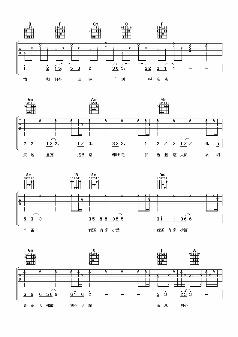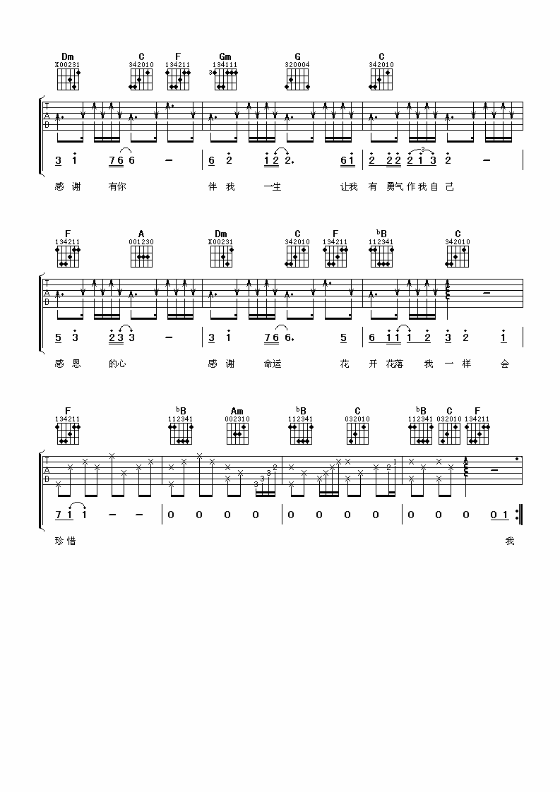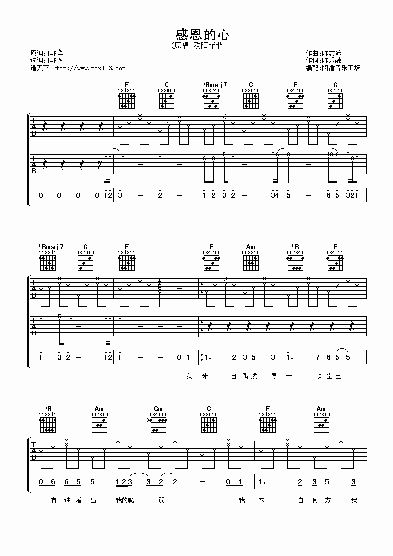 曲谱介绍: 欧阳菲菲《感恩的心》吉他弹唱谱,采用F调指法编配,阿潘音乐工厂编配出品,共有3张高清图谱。