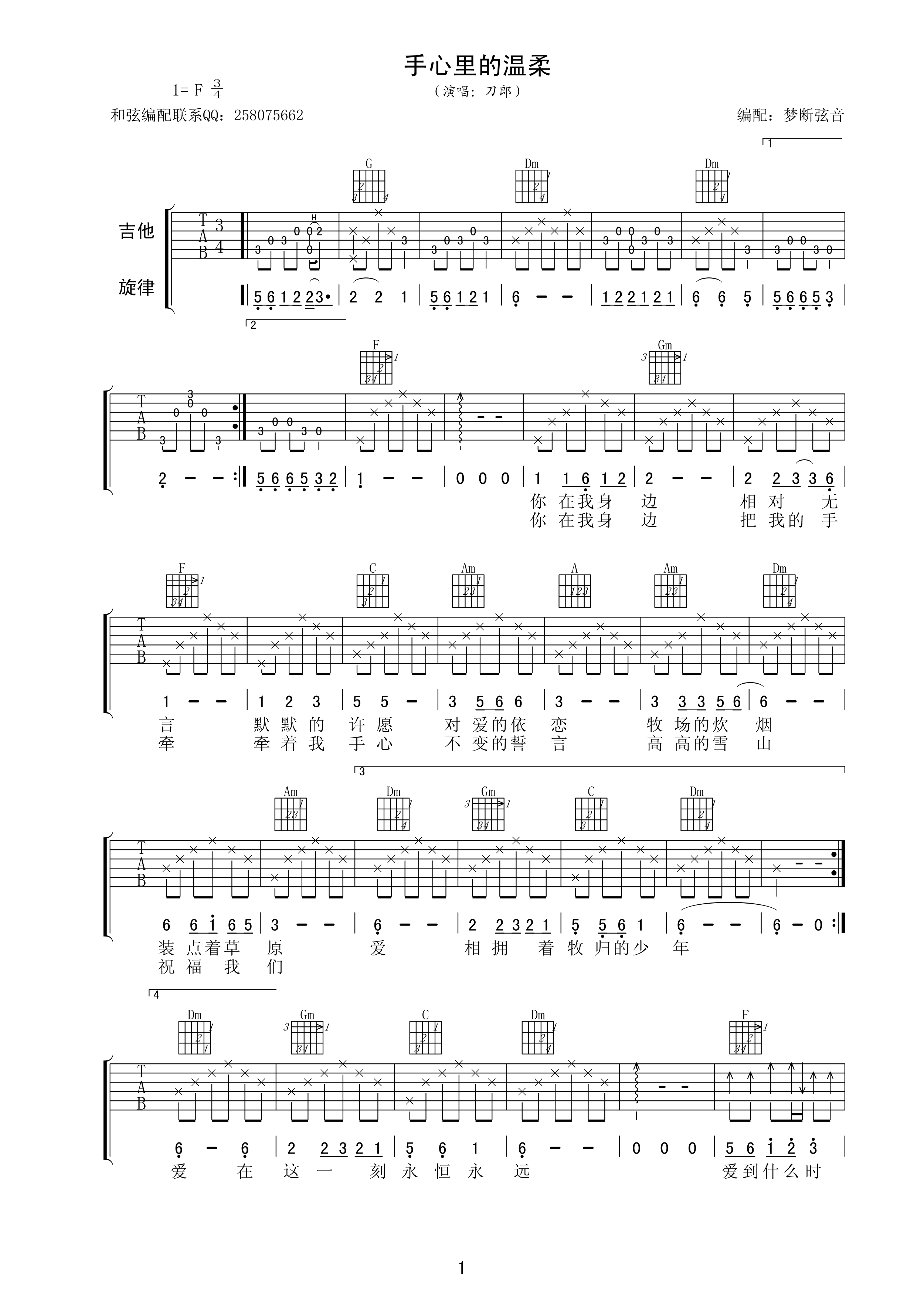 曲谱介绍: 刀郎《手心里的温柔》吉他弹唱谱,采用F调指法编配,梦断弦音编配出品,共有2张高清图谱,免翻页排版设计。