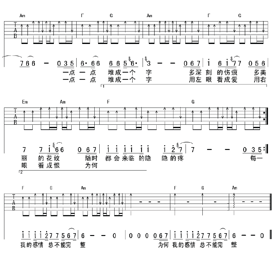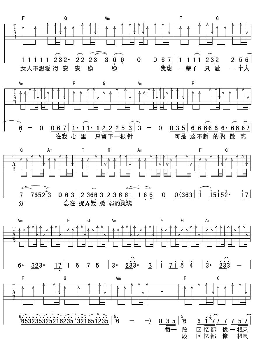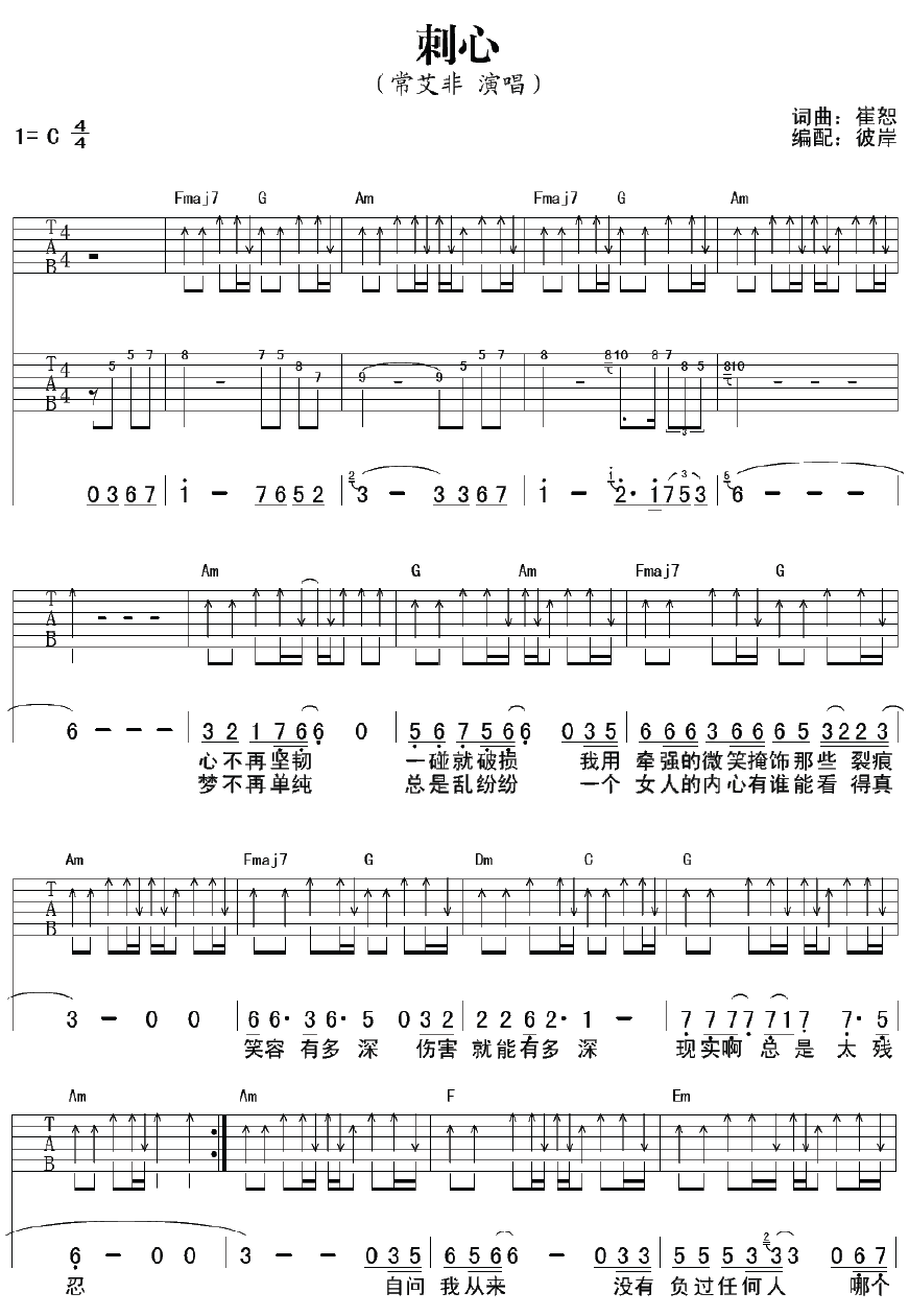 曲谱介绍: 常艾非《刺心》吉他弹唱谱,采用C调指法编配,彼岸吉他编配出品,共有3张高清图谱。