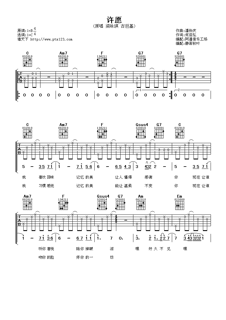 曲谱介绍: 古巨基《许愿》吉他弹唱谱,采用C调指法编配,阿潘音乐工厂编配出品,共有3张高清图谱。