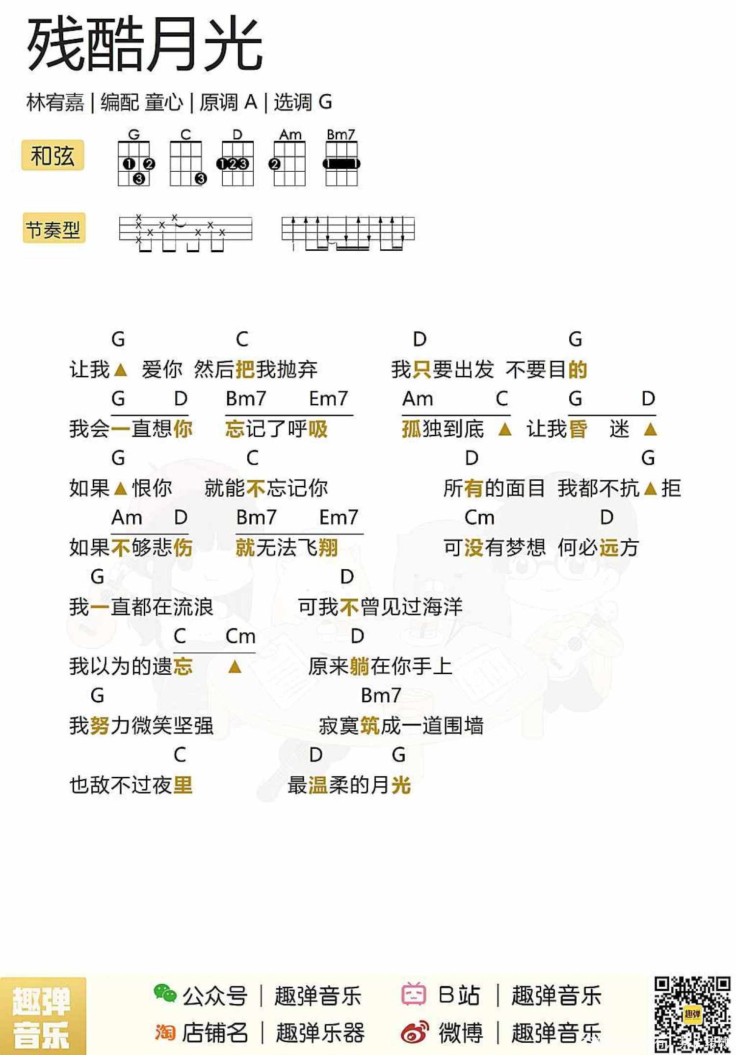 曲谱介绍: Aloha~ 最近网易云推出的 青春重置计划第三弹 由费启鸣小哥哥翻唱了这首 林宥嘉的「残酷月光」 趣酱也重新跑去听了这首歌 不知不觉就循环了一整天~   「残酷月光」弹唱谱: