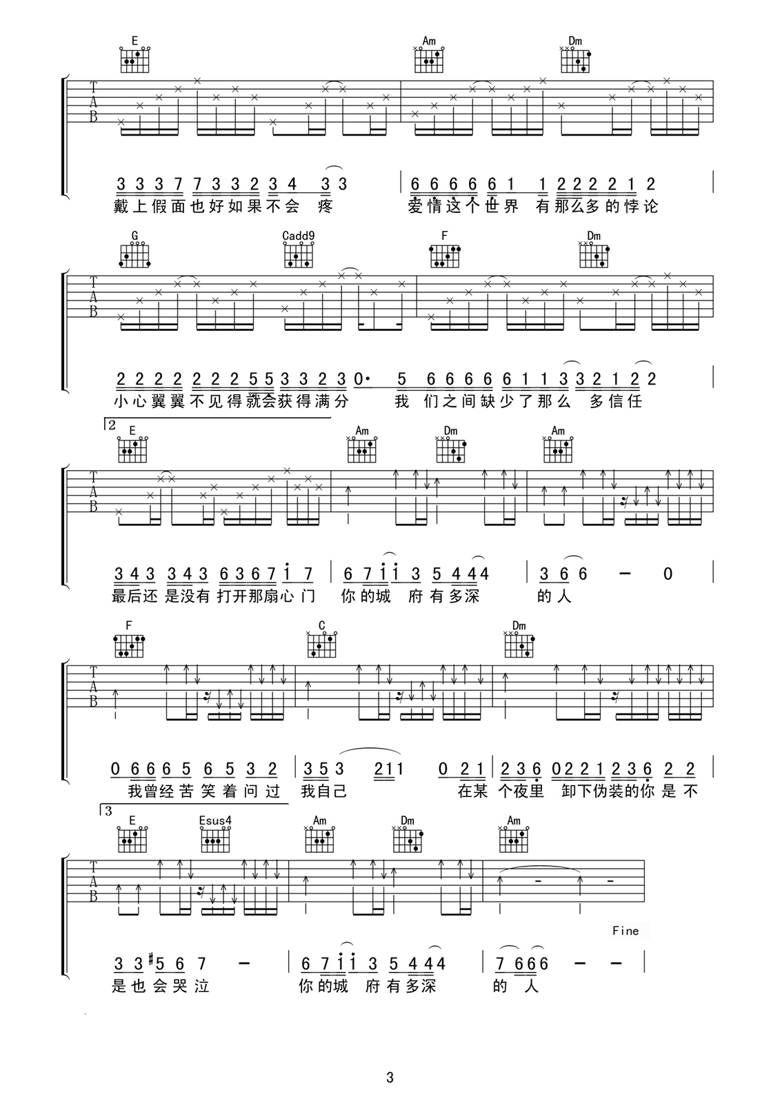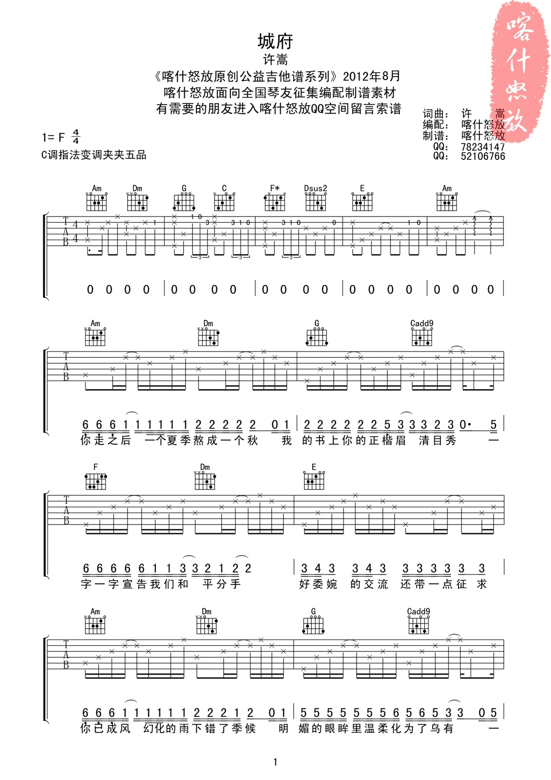 曲谱介绍: 许嵩《城府》吉他弹唱谱,采用C调指法编配,喀什怒放编配出品,共有3张高清图谱。