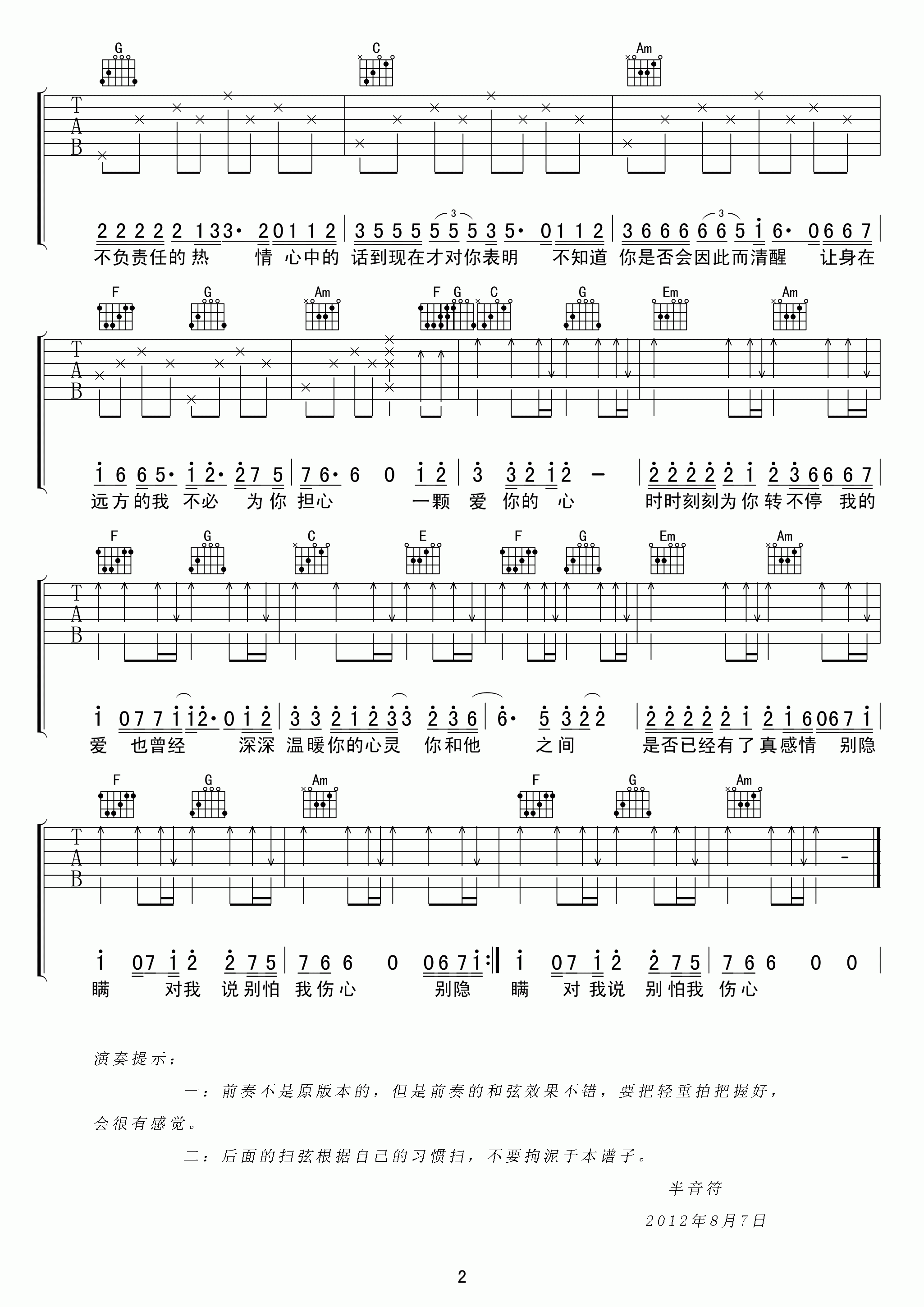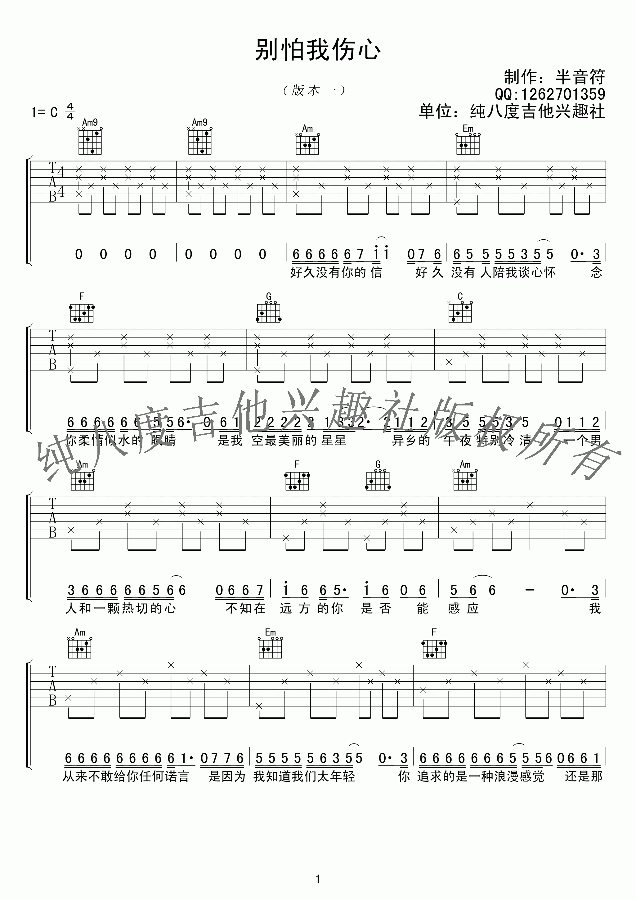 曲谱介绍: 别怕我伤心《别怕我伤心C调高清版_纯八度》吉他弹唱谱,采用C调指法编配,纯八度吉他兴趣社编配出品,共有2张高清图谱,免翻页排版设计。