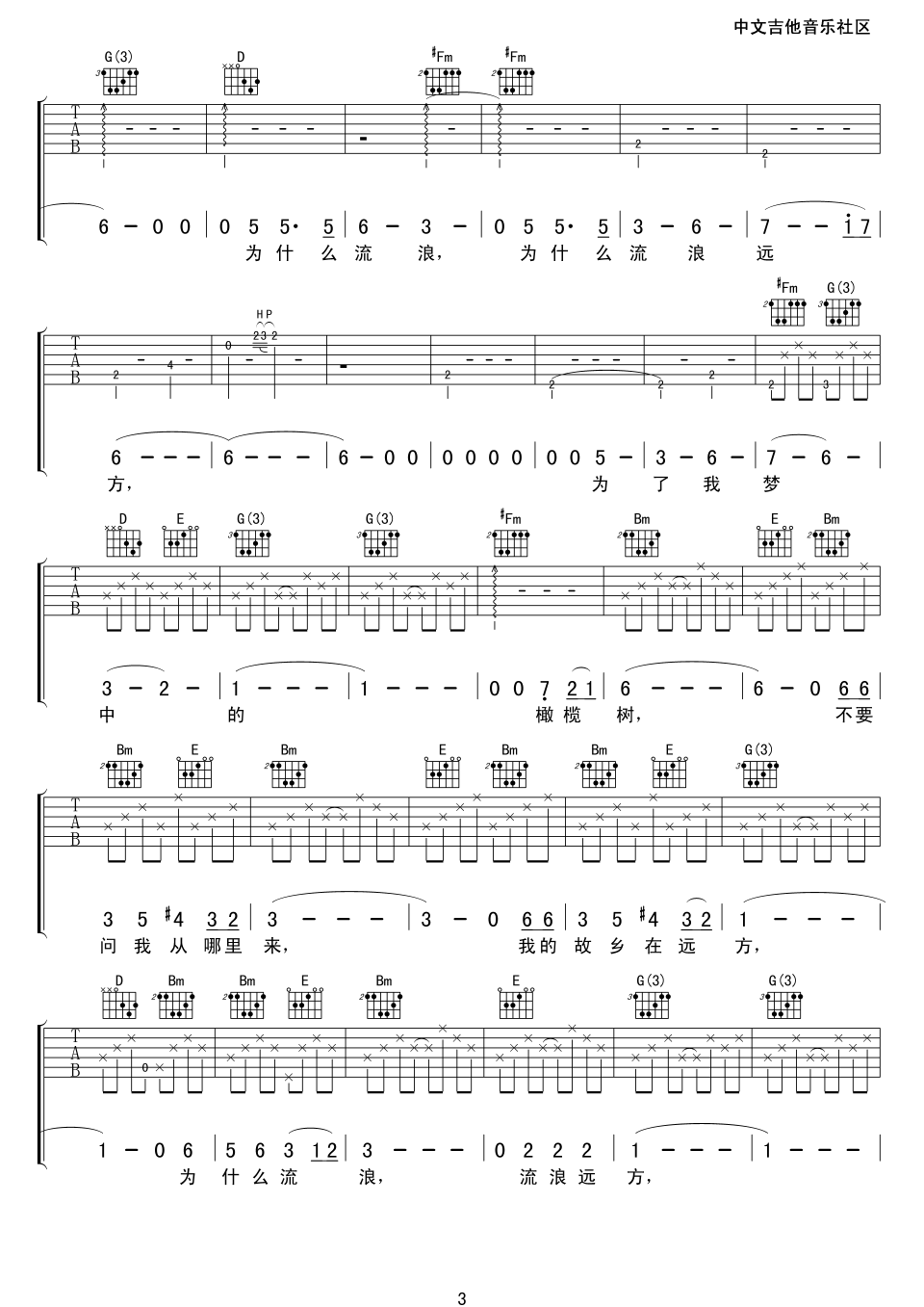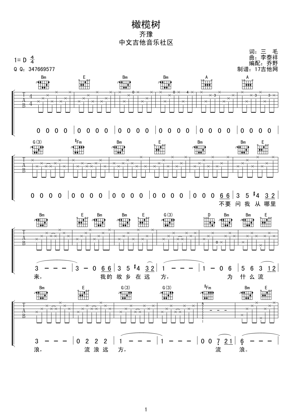 曲谱介绍: 齐豫《橄榄树》吉他弹唱谱,采用D调指法编配,17吉他编配出品,共有4张高清图谱。
