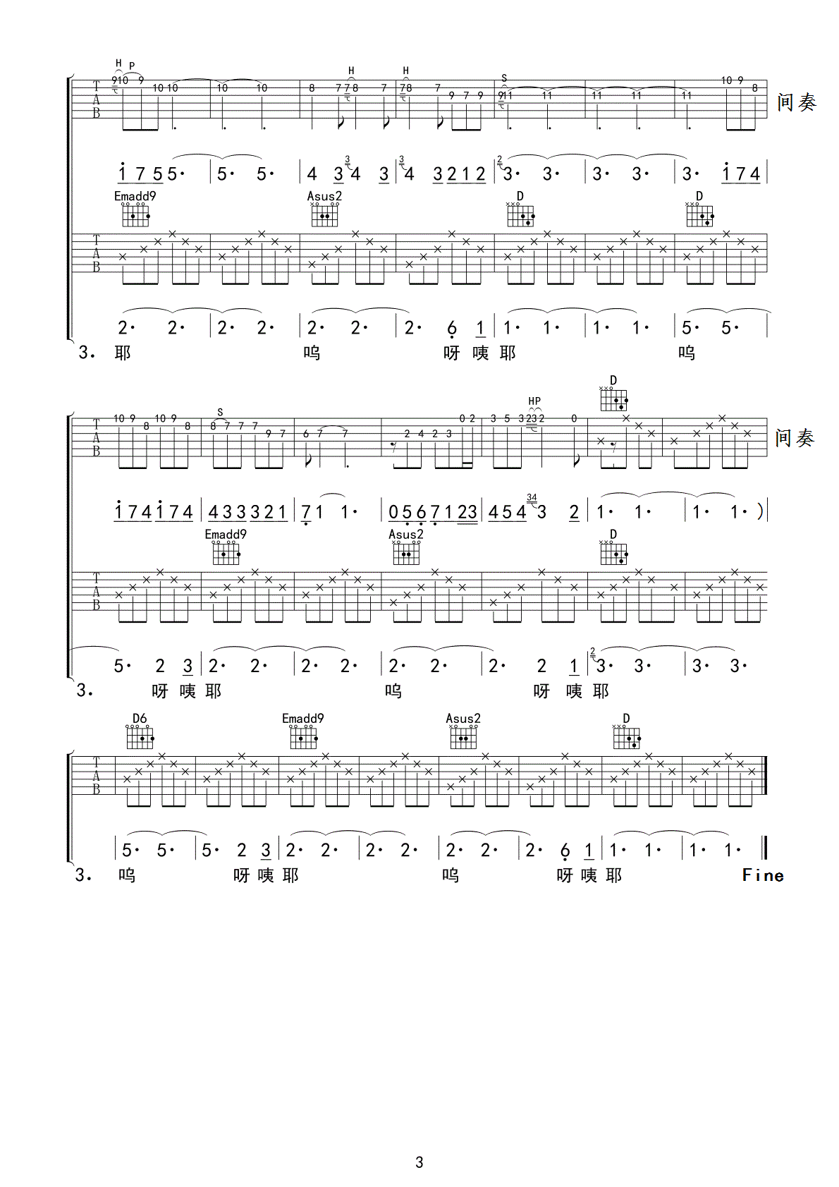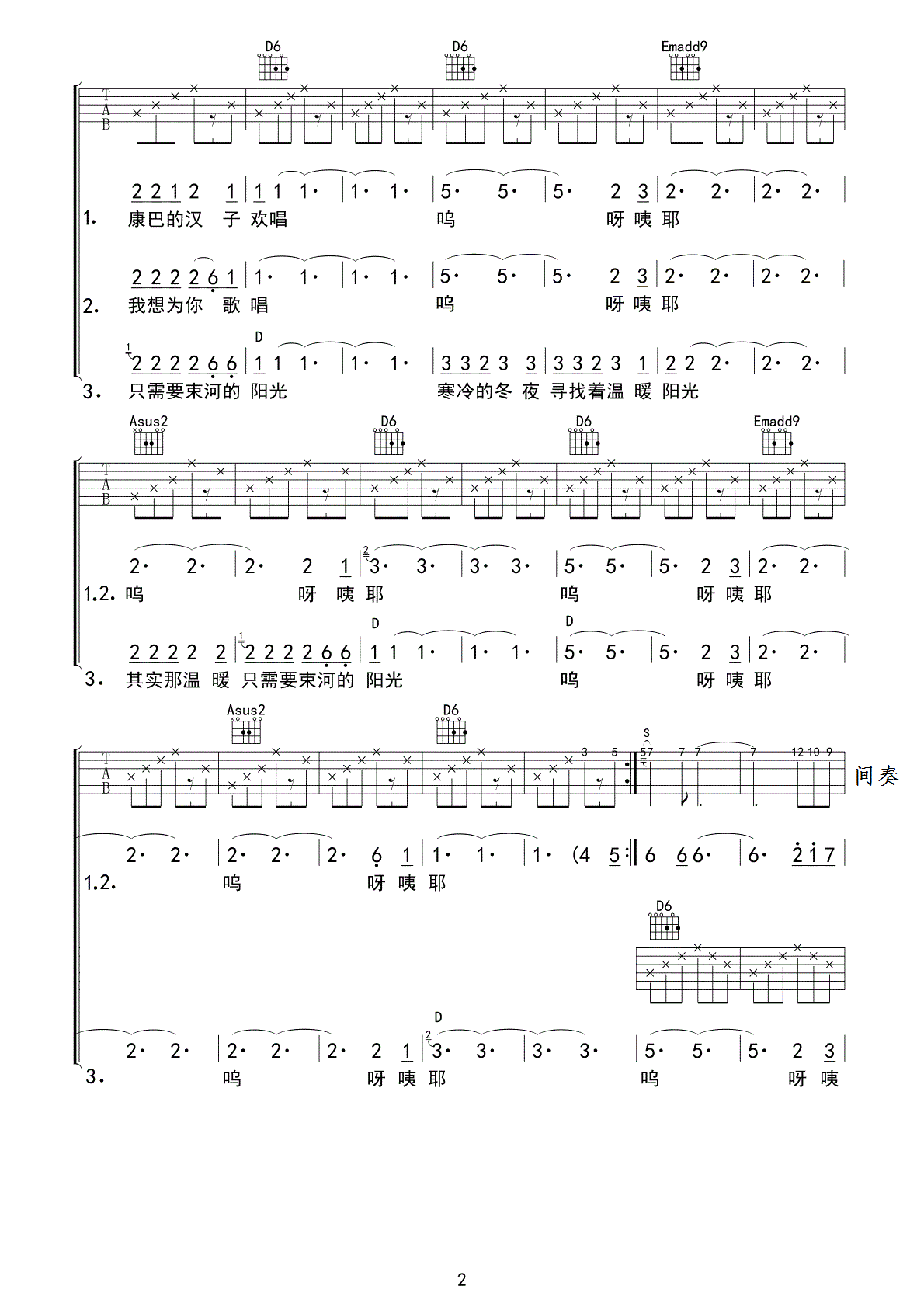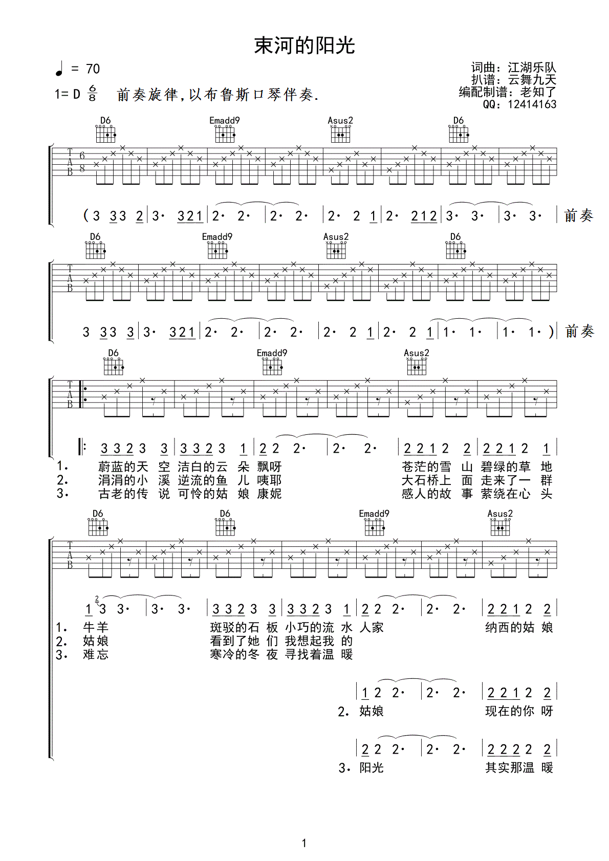曲谱介绍: 江湖乐队《束河的阳光》吉他弹唱谱,采用D调指法编配,老知了编配出品,共有3张高清图谱。