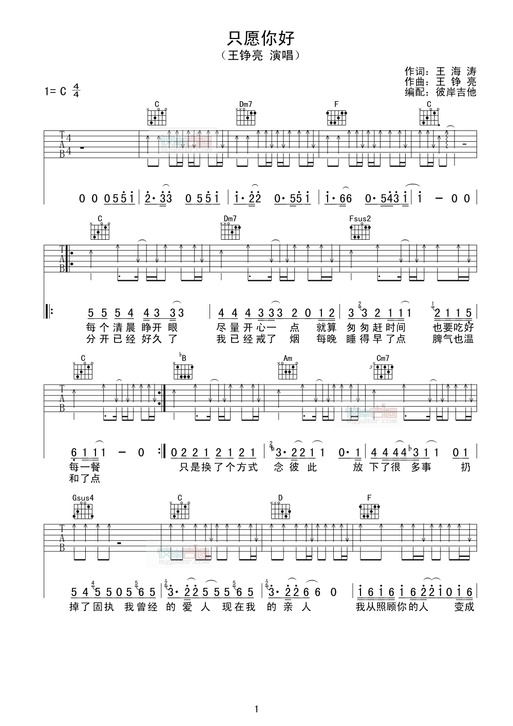 只愿你好 C调_彼岸吉他谱 - 只愿你好 - C调吉他弹唱谱