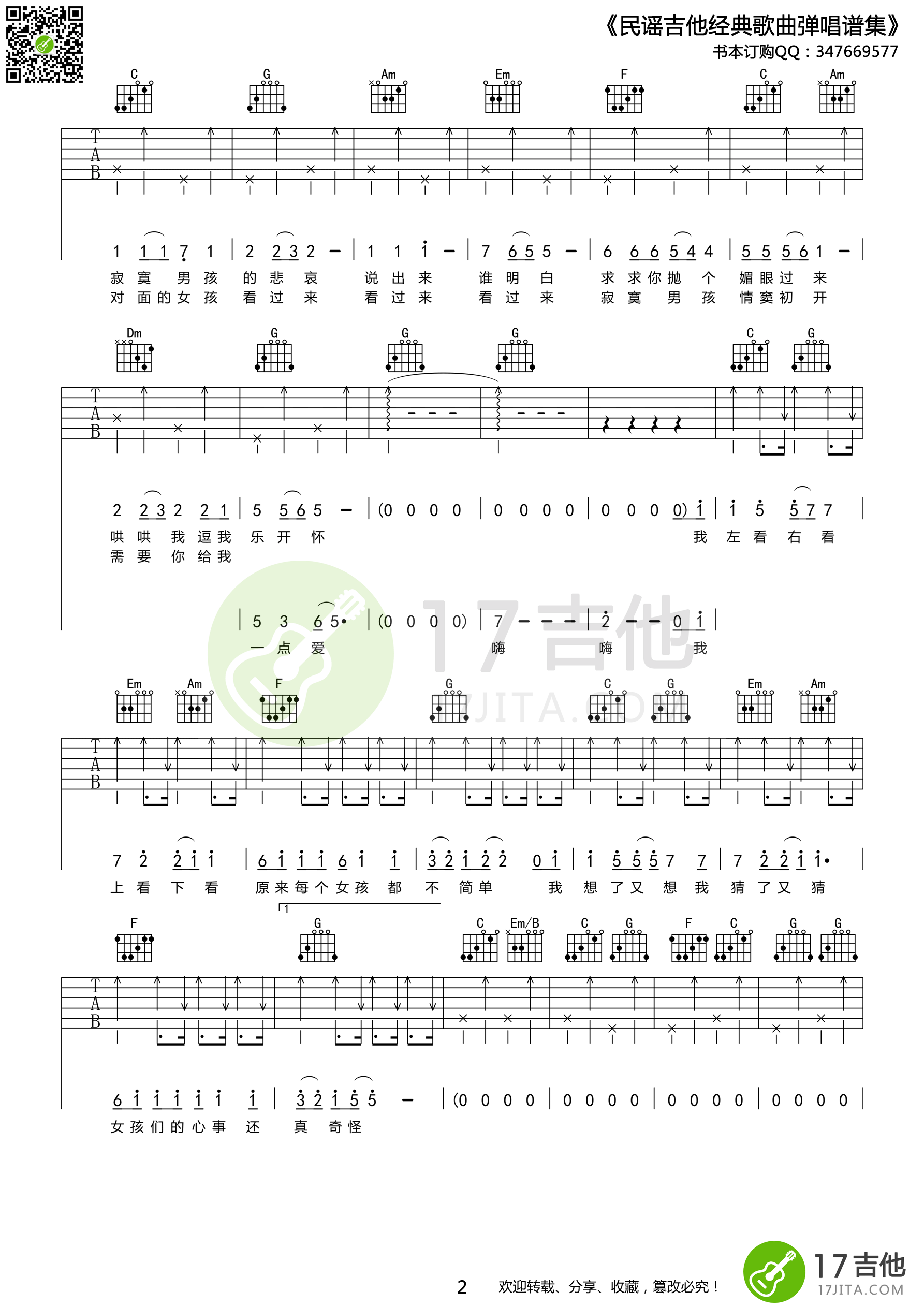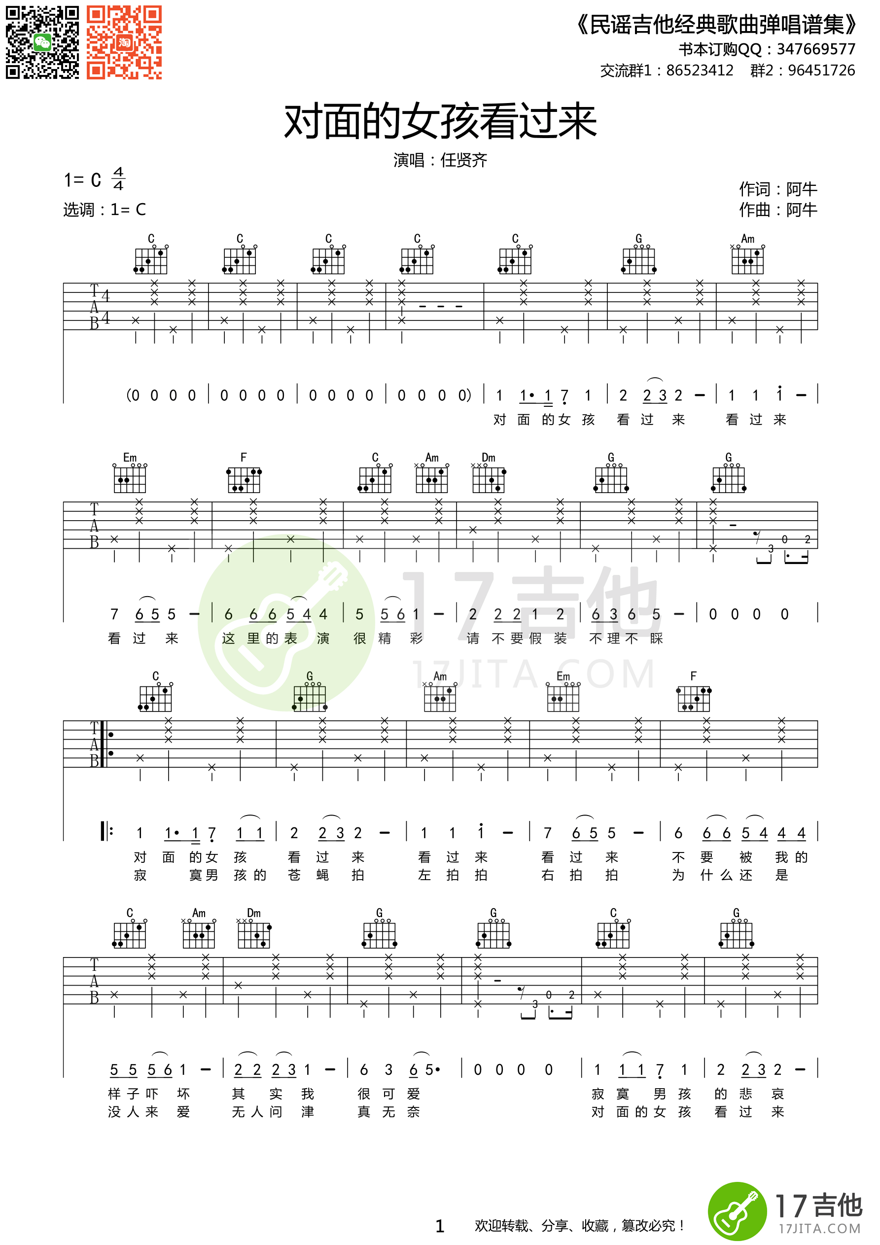 曲谱介绍: 任贤齐《对面女孩看过来》吉他弹唱谱,采用C调指法编配,17吉他编配出品,共有3张高清图谱。