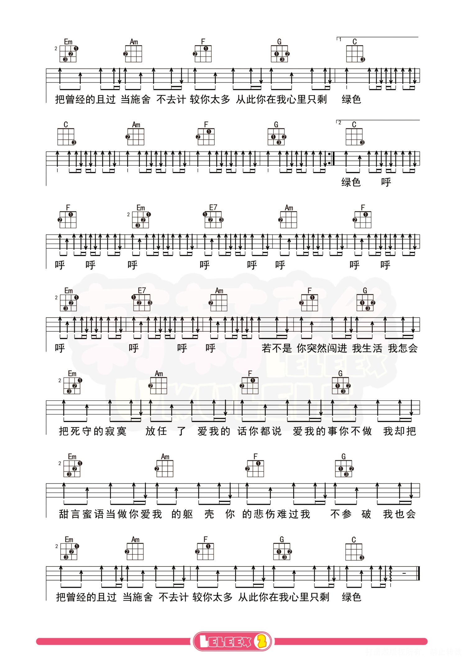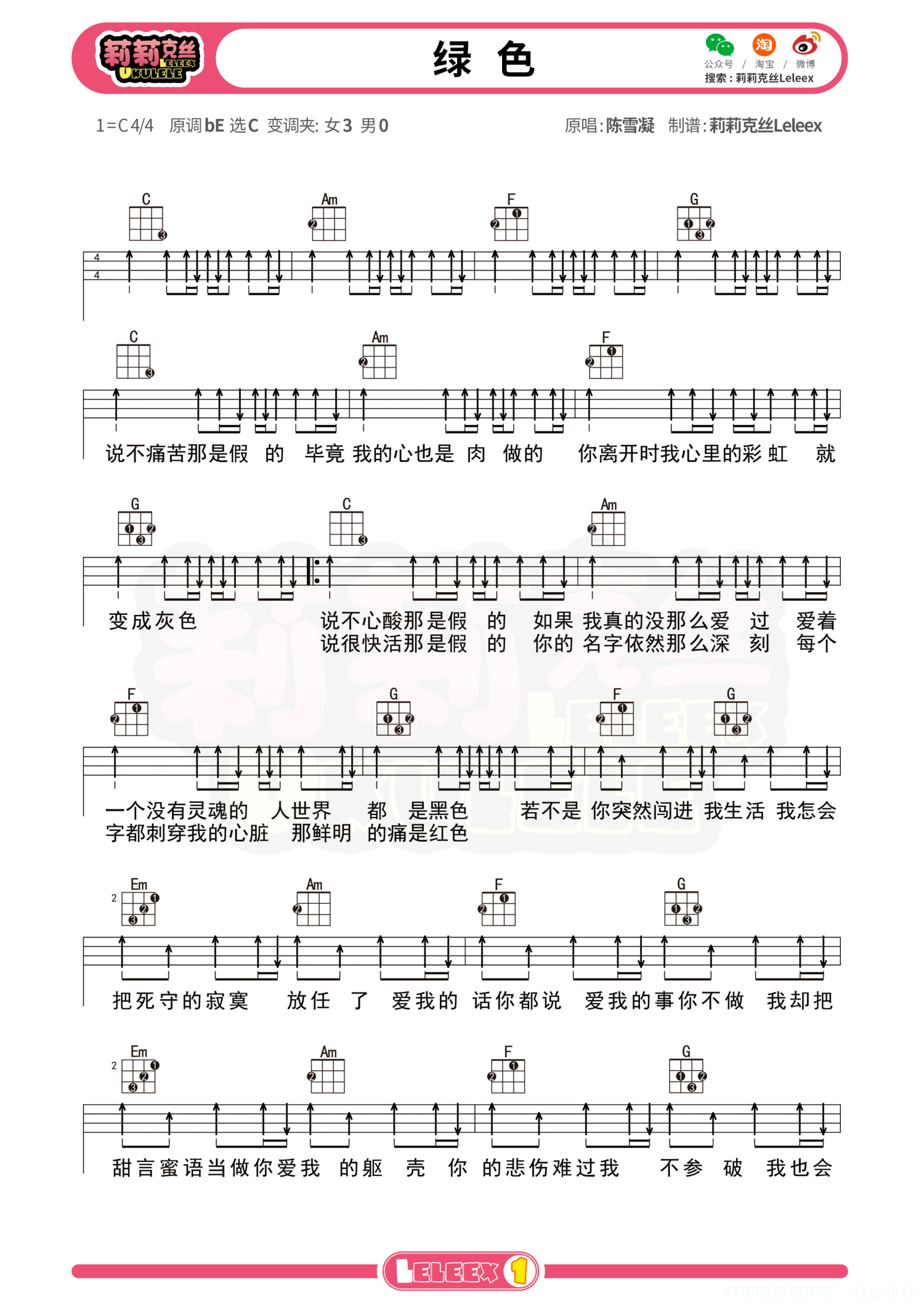 曲谱介绍: 「绿色」弹唱教学 曲谱 更多尤克里里教学/曲谱 关注@莉莉克丝Leleex