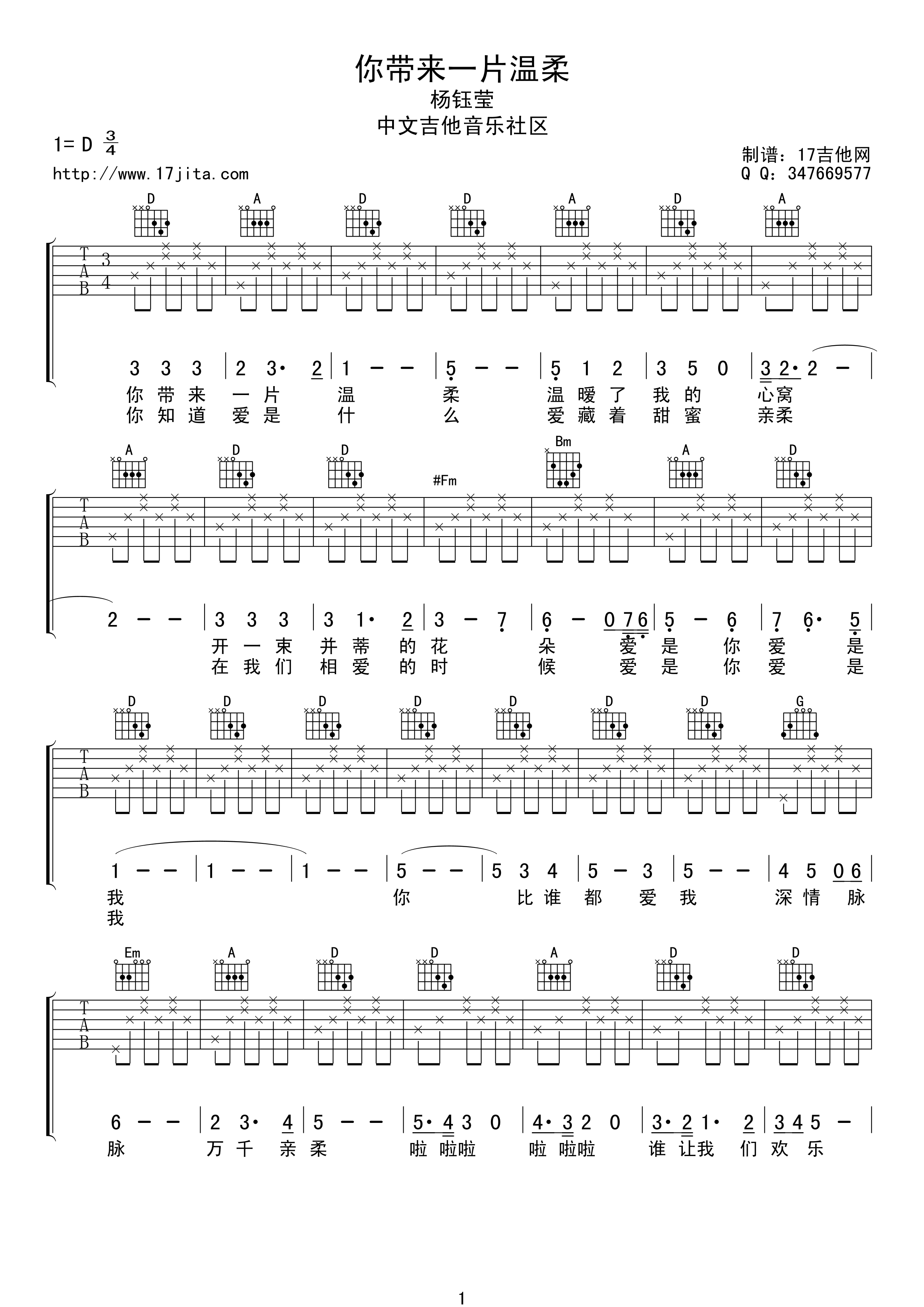 曲谱介绍: 杨钰莹《你带来一片温柔》吉他弹唱谱,采用D调指法编配,17吉他编配出品,共有2张高清图谱,免翻页排版设计。