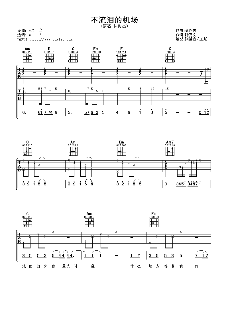 曲谱介绍: 林俊杰《不流泪的机场》吉他弹唱谱,采用C调指法编配,阿潘音乐工厂编配出品,共有4张高清图谱。