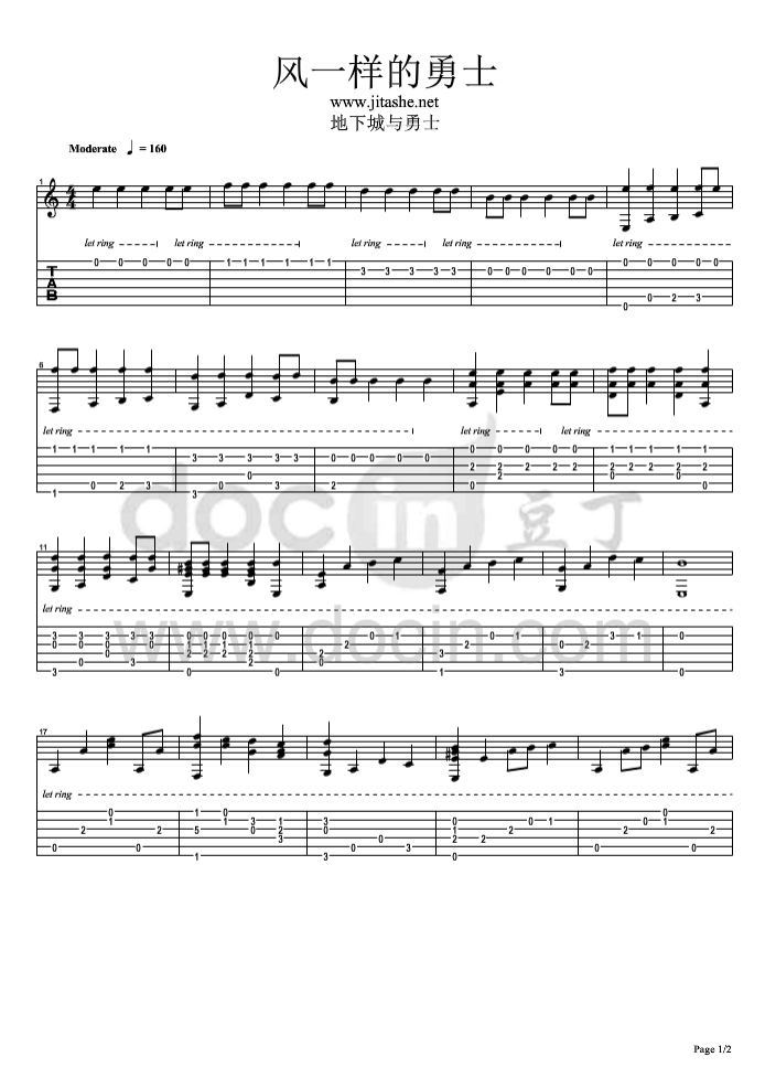 曲谱介绍: 地下城与勇士《风一样的勇士》吉他独奏谱,豆丁网编配出品,共有2张高清图谱,免翻页排版设计。