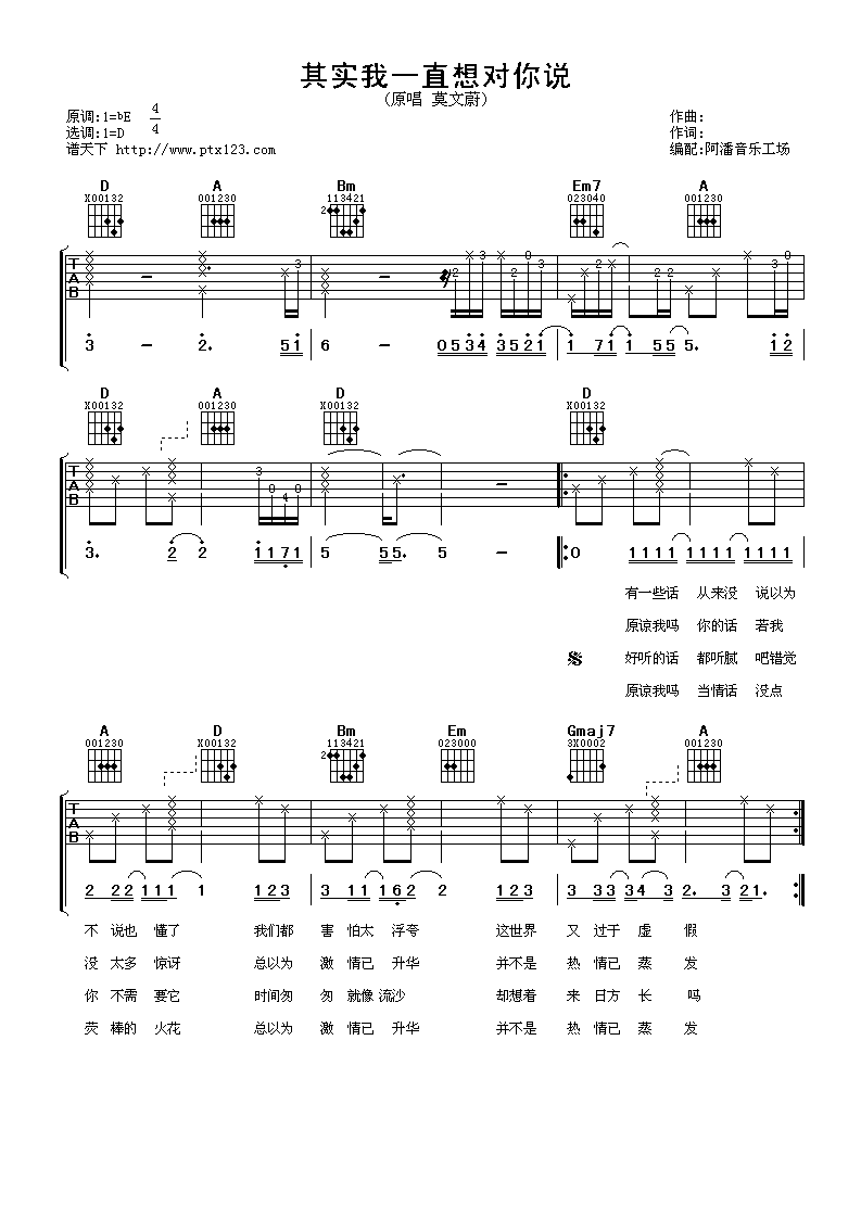 曲谱介绍: 莫文蔚《其实我一直想对你说》吉他弹唱谱,采用D调指法编配,阿潘音乐工厂编配出品,共有4张高清图谱。