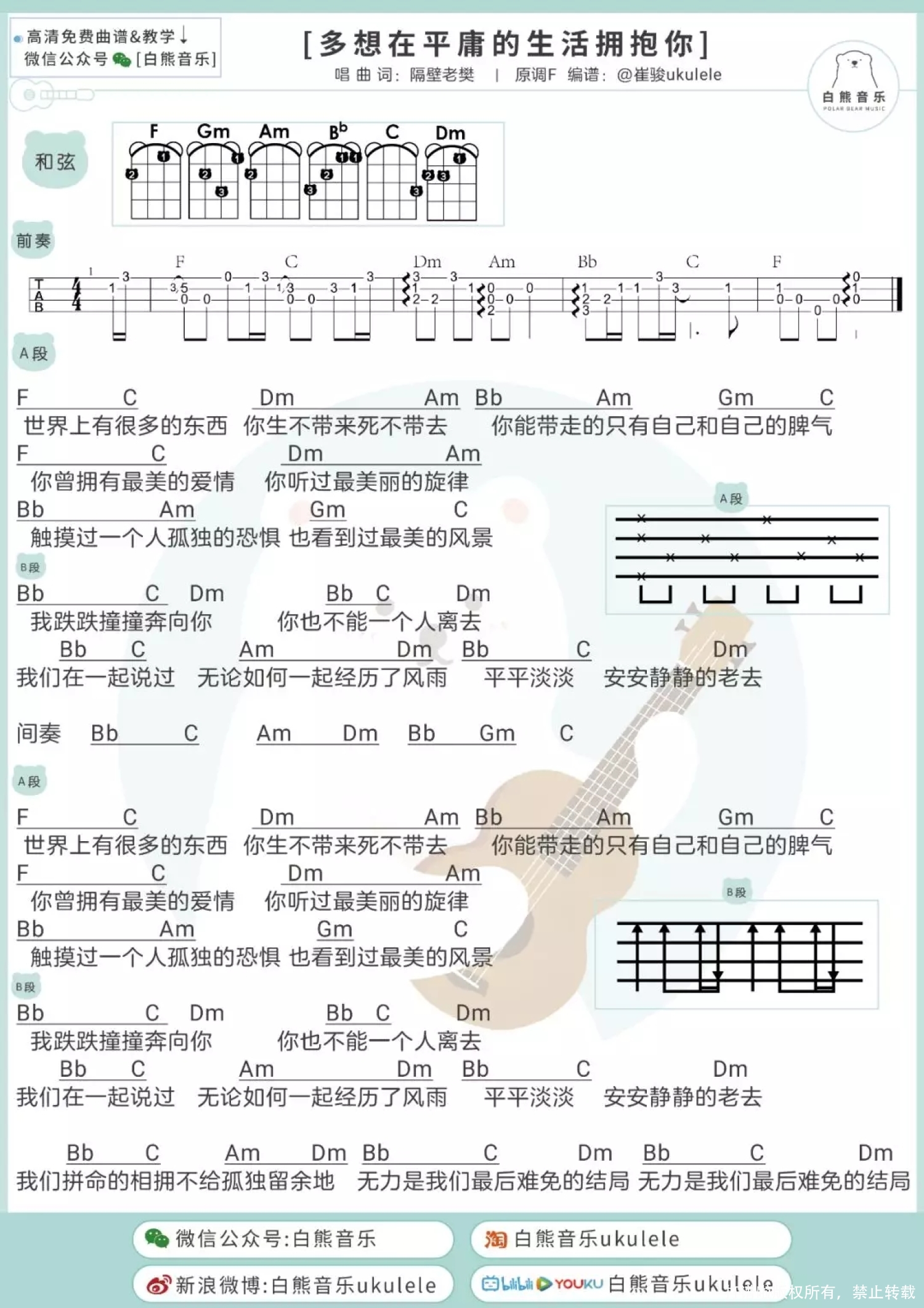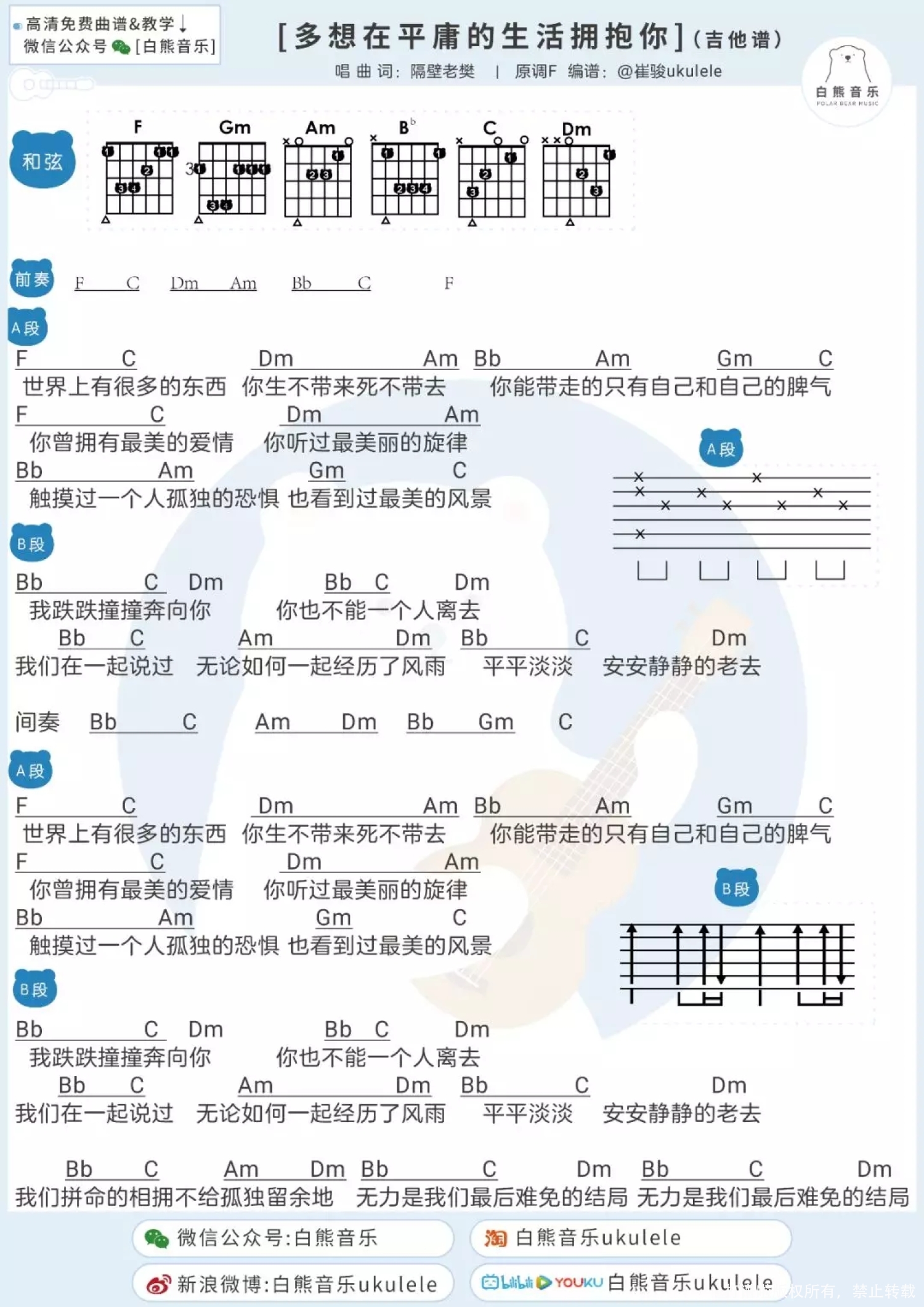 曲谱介绍: Ukulele弹唱教学|@崔骏ukulele 「多想在平庸的生活拥抱你」弹唱谱 目录   "我跌跌撞撞奔向你 你也不能一个人离去" 能听懂这首歌的人,怕都是经历过故事的人啊   Ukulele弹唱教学|@崔骏ukulele   「多想在平庸的生活拥抱你」弹唱谱 1、尤克里里谱   2、吉他谱
