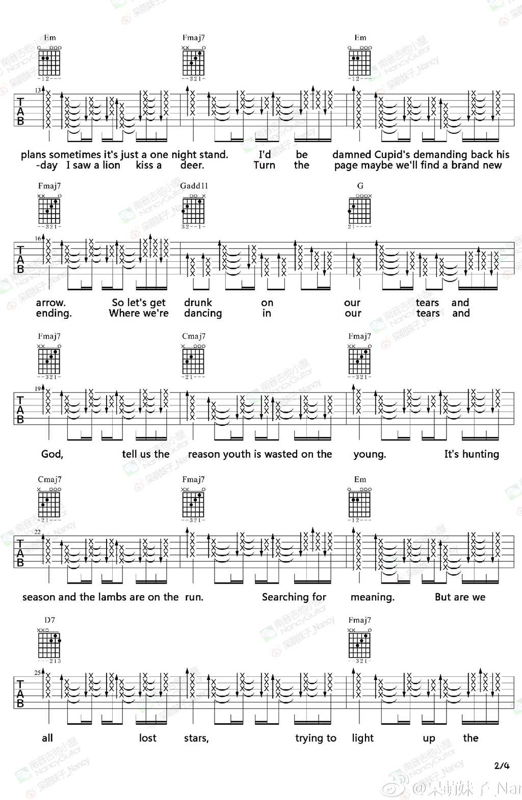 曲谱介绍: Lost《LostStars》吉他弹唱谱,采用F调指法编配,南音吉他小屋编配出品,共有4张高清图谱。