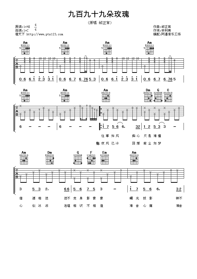 曲谱介绍: 邰正宵《九百九十九朵玫瑰》吉他弹唱谱,采用C调指法编配,阿潘音乐工场编配出品,共有3张高清图谱。
