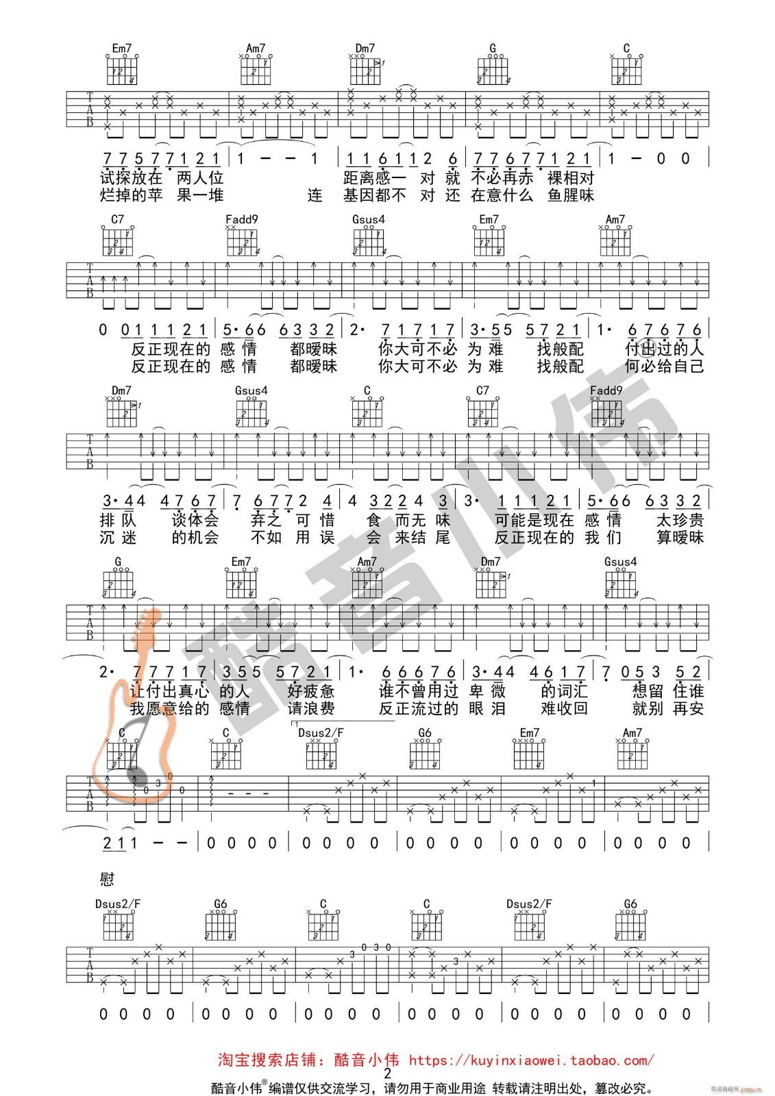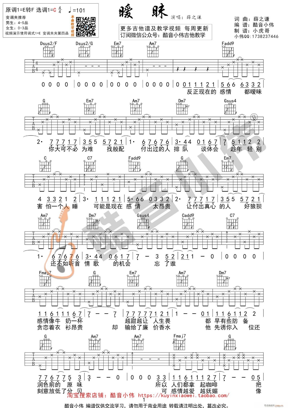 曲谱介绍: 薛之谦《暖味》吉他弹唱谱,采用C调指法编配,酷音小伟编配出品,共有3张高清图谱。