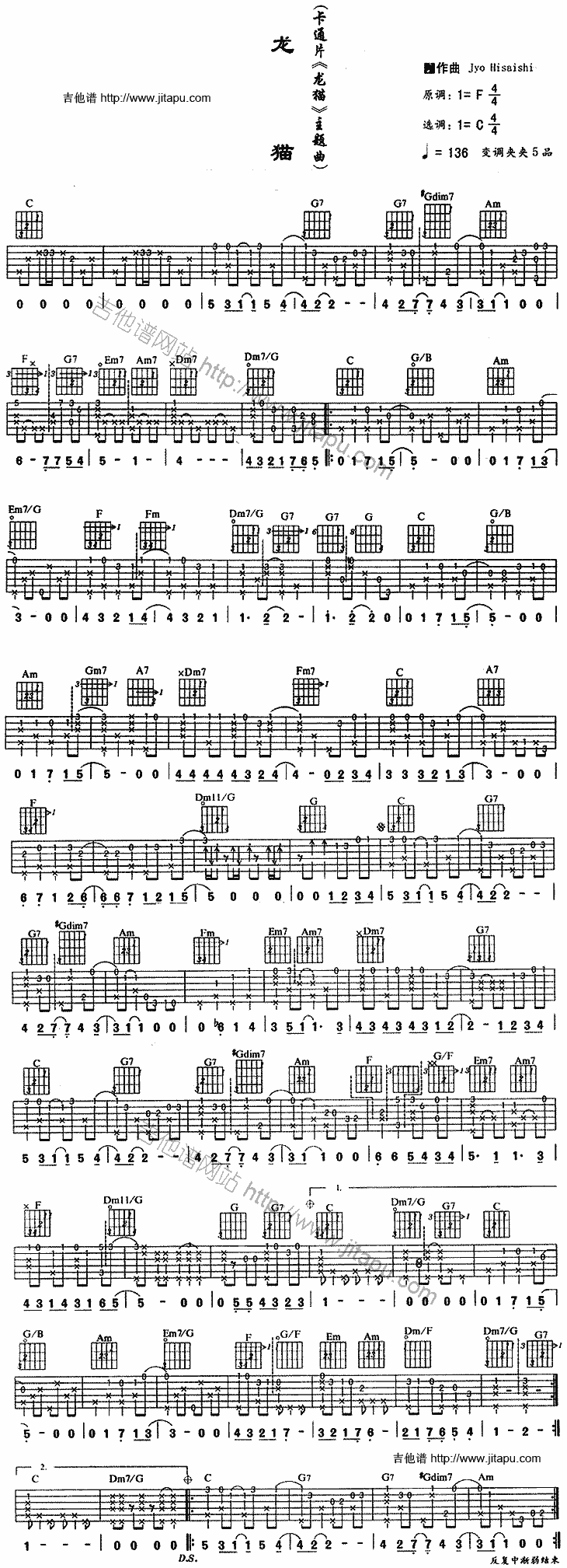 曲谱介绍: 宫崎骏《龙猫》吉他独奏谱,采用C调指法编配,共有1张高清图谱,免翻页排版设计。