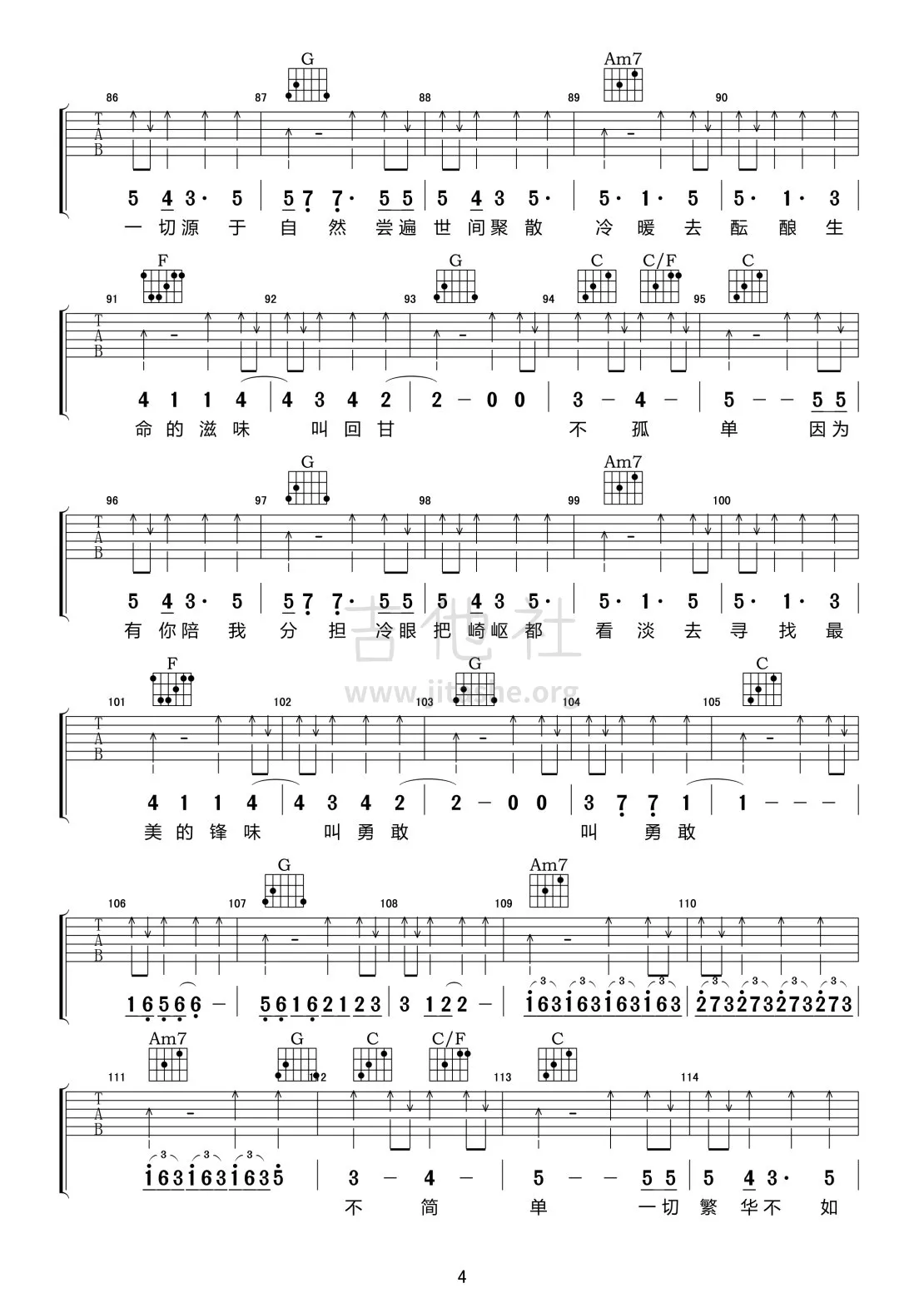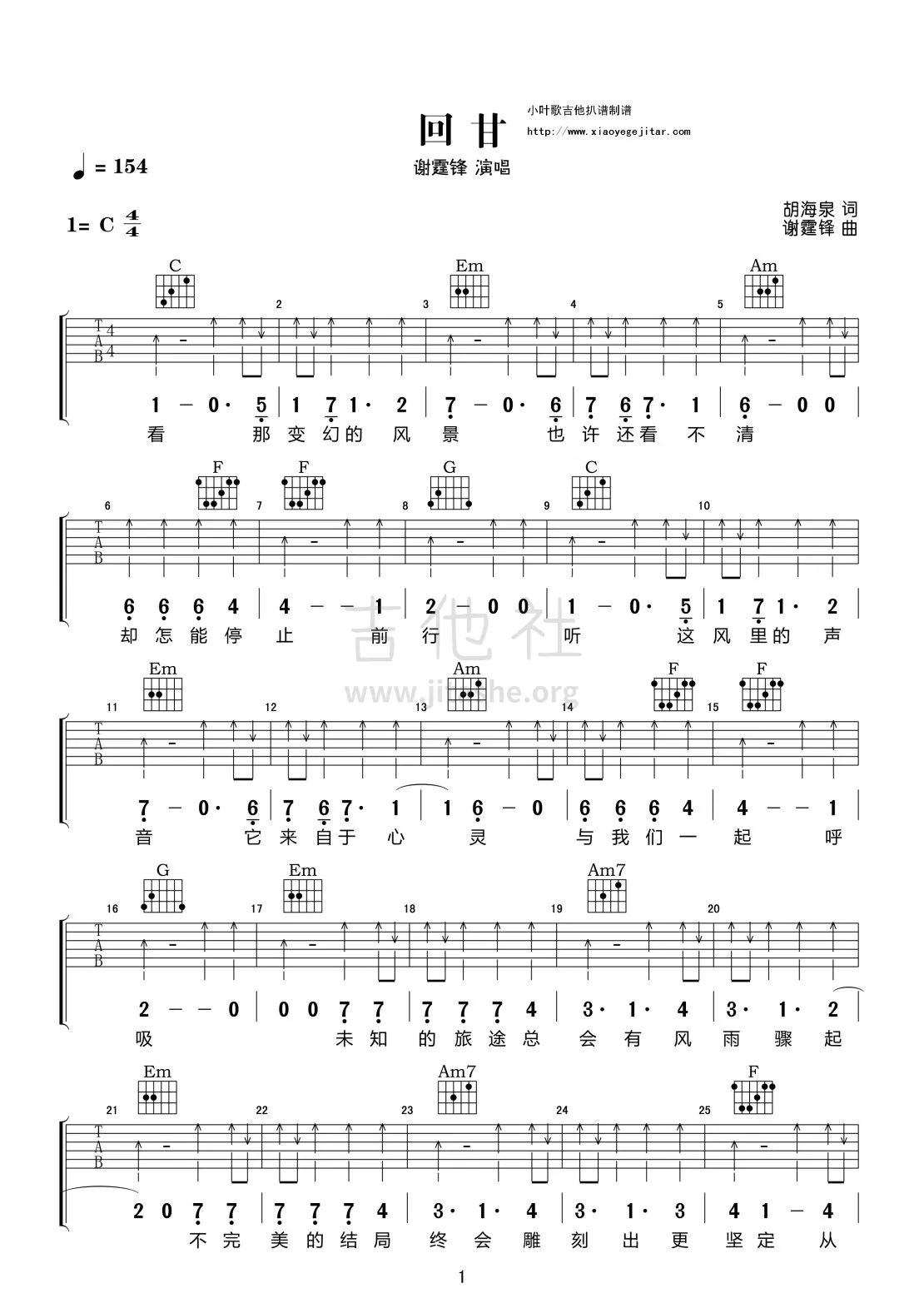 曲谱介绍: 谢霆锋《回甘》吉他弹唱谱,采用C调指法编配,吉他社编配出品,共有5张高清图谱。