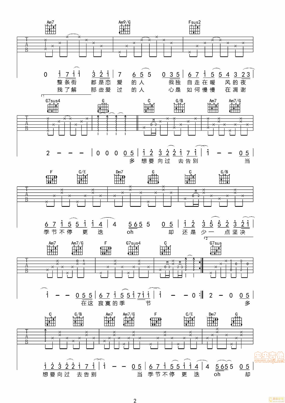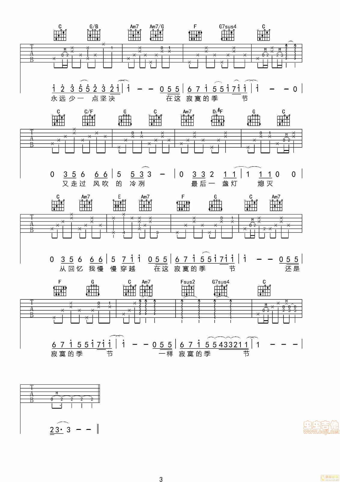 曲谱介绍: 陶喆《寂寞季节》吉他弹唱谱,采用C调指法编配,虫虫吉他编配出品,共有3张高清图谱。