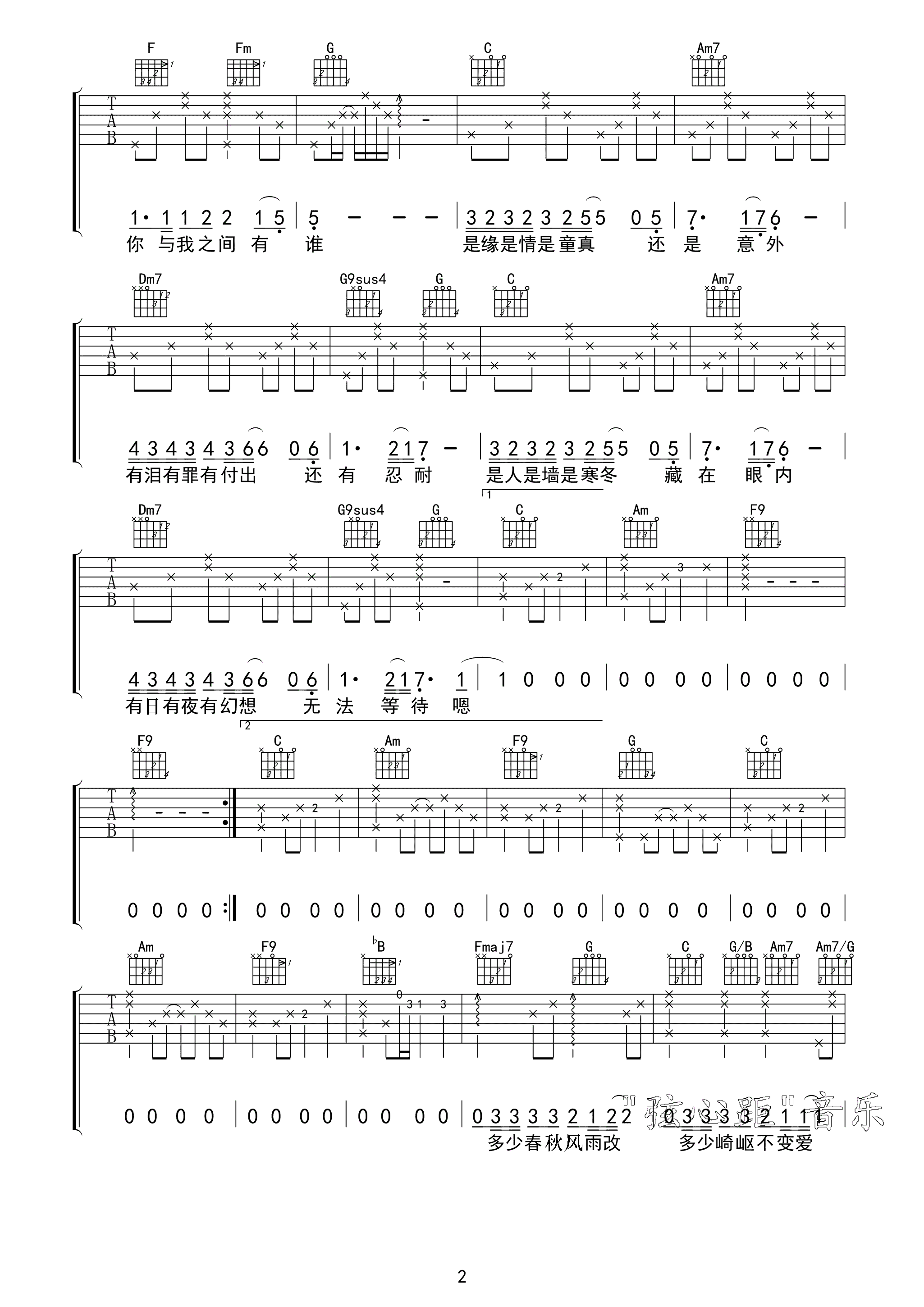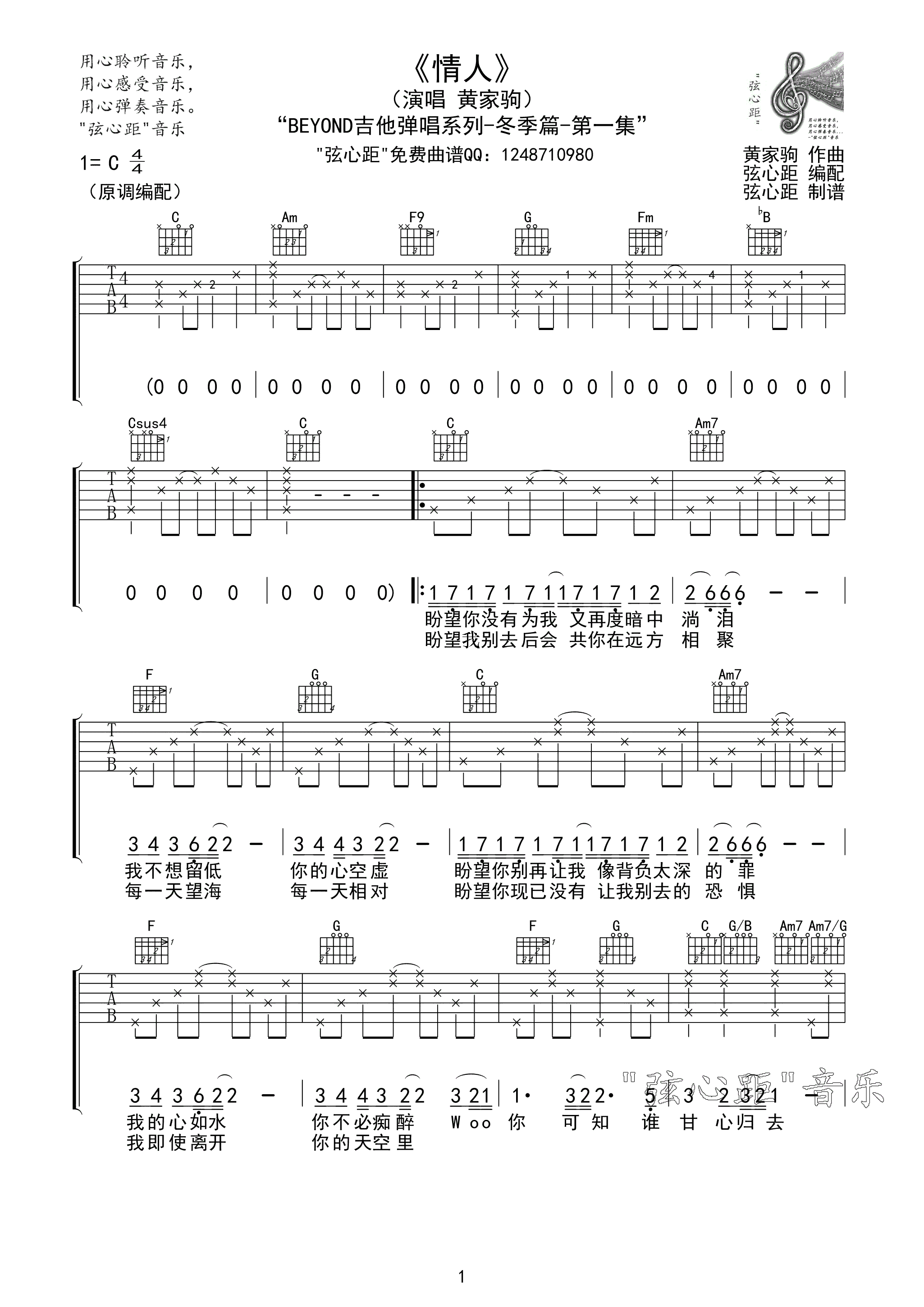 曲谱介绍: Beyond《情人》吉他弹唱谱,采用C调指法编配原版,弦心距编配出品,共有3张高清图谱。