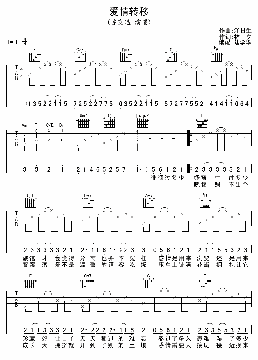 曲谱介绍: 陈奕迅《爱情转移》吉他弹唱谱,采用F调指法编配,陆学华编配出品,共有4张高清图谱。