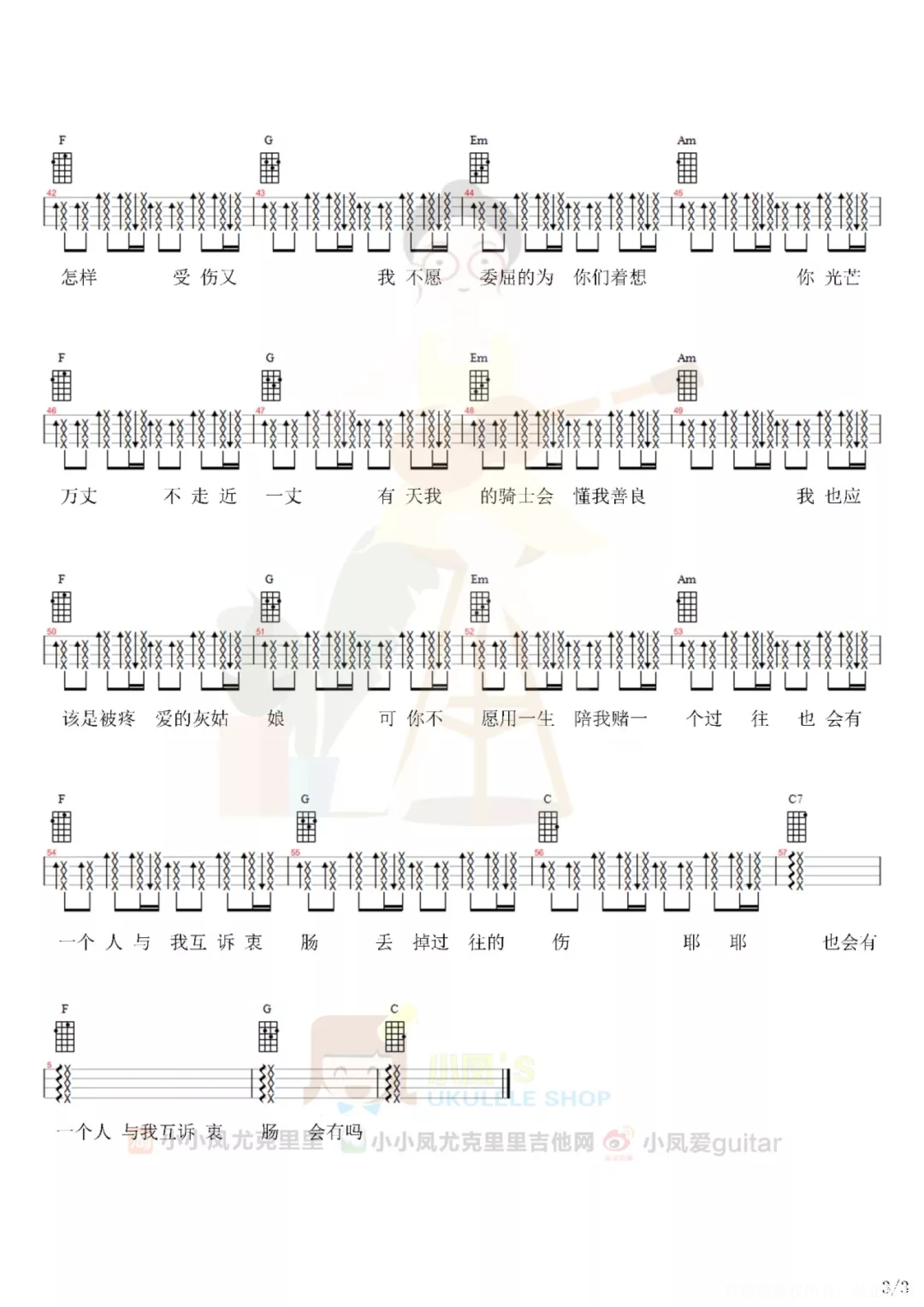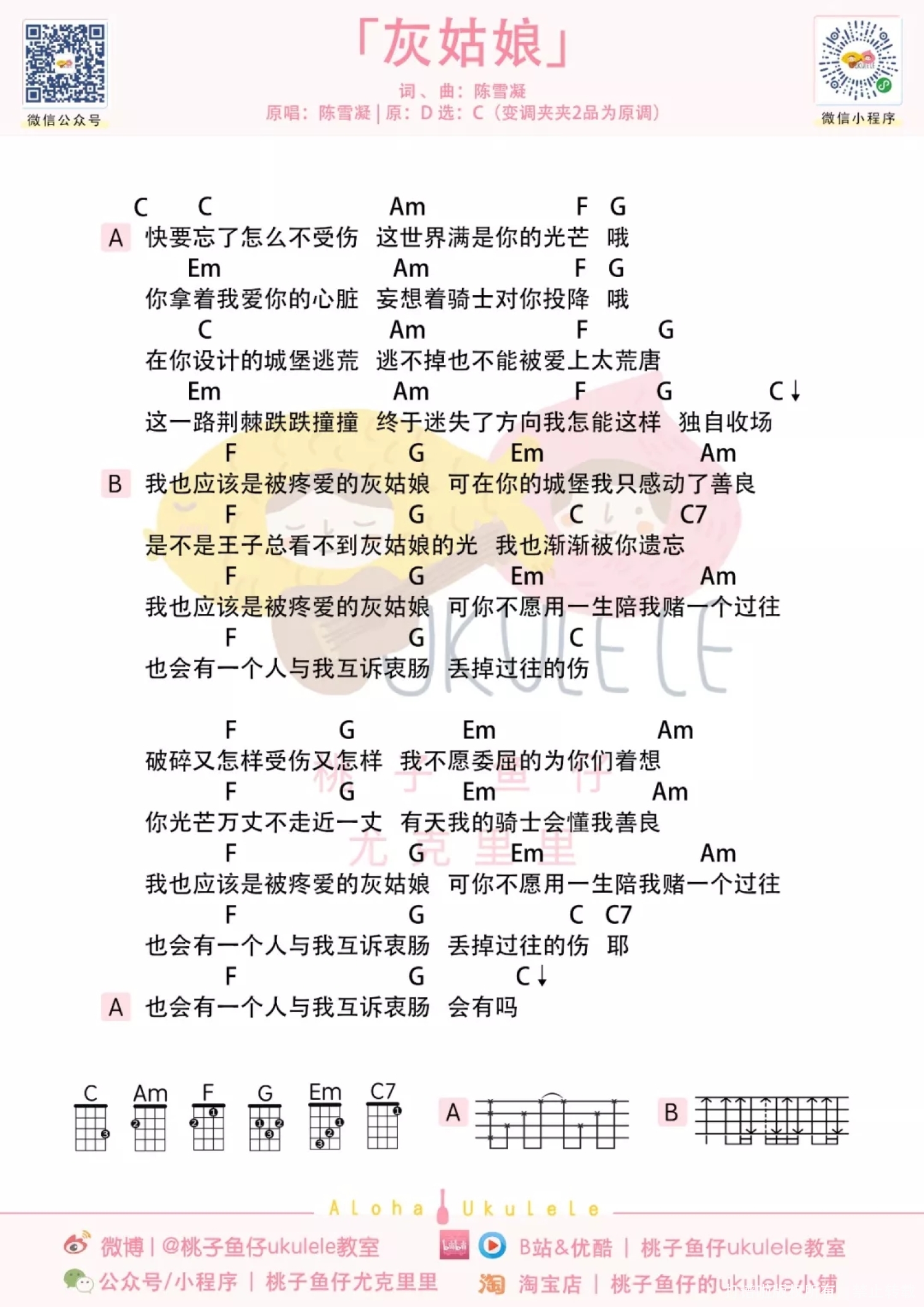 前段时间,帮我实体店的小学员上课的时候,我问她 “最近有没有喜欢的歌啊” “最近喜欢一首歌,是抖音的,好像叫绿色” “那你会唱吗” “我只会唱高潮,若不是你突然闯进我生活,我怎么把死守的寂寞放任了......" 说完立马唱起来了。 当时我真的有点被惊呆了,因为我的小学员才7岁不到。 直到那段时间公众号每天后台的点歌留言有百分之九十都是“绿色”之后,我就开始留意到这首歌,留意到这首歌的原唱陈雪凝。 无论你喜不喜欢,她的歌确实有着惊人的流传度。 她原创歌曲的大热也让她有机会在 2018 年去到了二十几个城市,开了自己的小型巡演。 就像很多人批判曾经的 QQ 音乐三巨头一样,也有人批评她的歌曲无病呻吟。 但这位小姑娘是这么回答的: 有的人在听我的歌时,正好处于一个积极的心态中,就会觉得无病呻吟。 而有的人恰好在一个难过的时间段,可能这首歌就走进他的心里。 这比如《假装》里有一句歌词唱的就是年少时,面对感情的不成熟: 别再犯傻,再剪短发 好像用一场外型上的大改变,就可以抗议一段感情,就可以宣誓着自己的态度。 也有很多人喜欢《你的酒馆对我打了烊》。 这首歌的歌词里依然充满了年少时,面对感情,我们总把控不好的过分情绪。 「你的酒馆对我打了样|尤克里里曲谱(请戳)」 歌里有着略带夸张和忧虑的表达,也许不够成熟。 但对于一个 17 岁的小姑娘,这些歌便是她在这个年龄段脑袋里的想法和声音。 而她把这些东西都化作了可以打动人的音乐。 最近推出的新歌《灰姑娘》,又一次强势的登顶了 QQ 音乐排行榜三大榜的榜首。 这位 00 后小姑娘的词,依然是充满那个年纪的过犹不及和幼龄夸张感。 灰姑娘 尤克里里曲谱 详谱: 因为年纪很小突然爆红所以要面对很多压力和争议,可她仍选择付诸努力。 00后都如此上进了,想一想我们16岁的时候在做什么? 对,那时我还在上高中,但是我也很感恩,因为我选择了音乐这条路,虽然有很多困难,但是有你们的支持,我觉得这些困难都不算什么。 无论你的理想是什么,如果准备好了,总会有机会发亮的。 抱一抱自己,继续前行,我们一起加油!