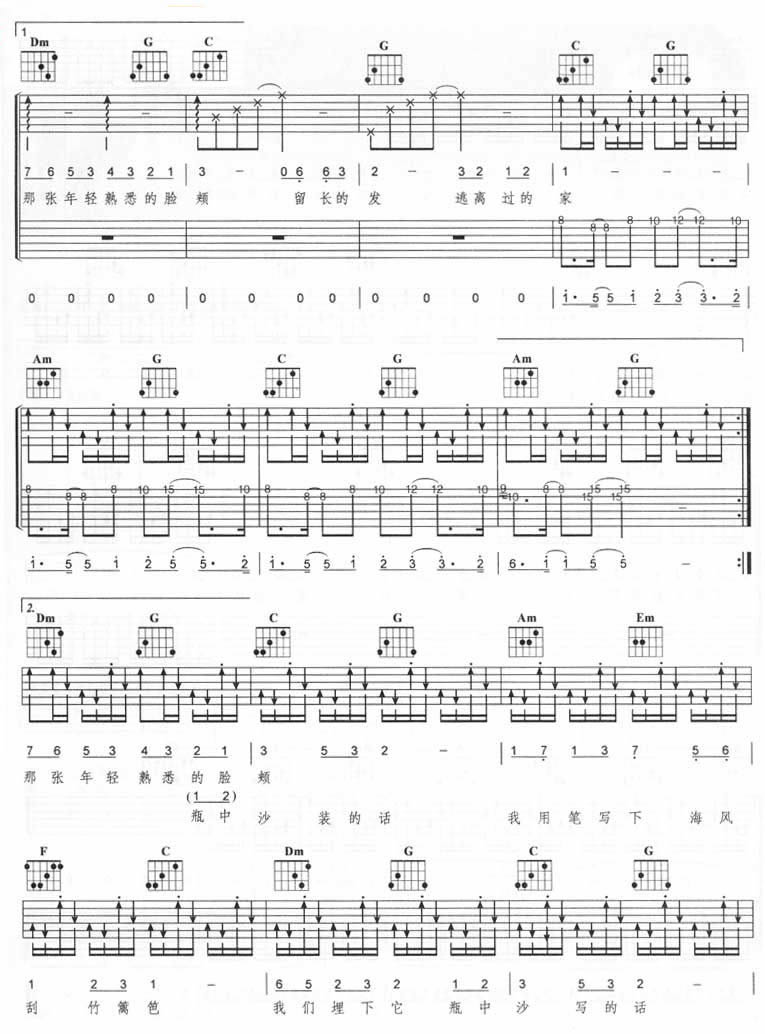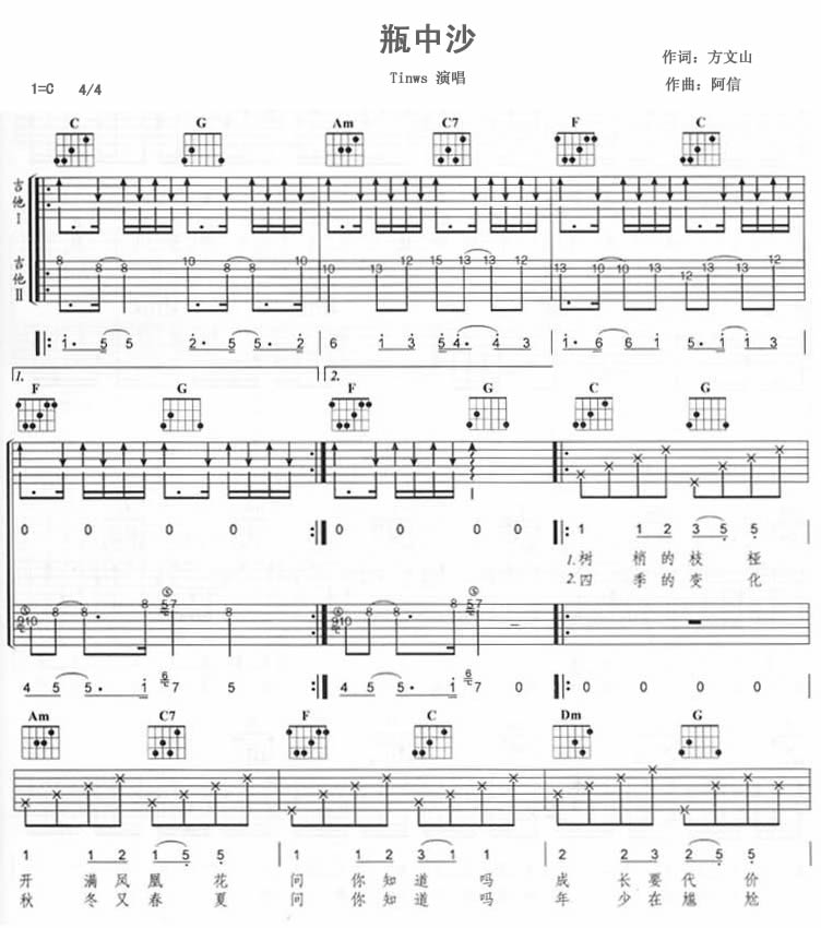 曲谱介绍: Twins《瓶中沙》吉他弹唱谱,采用C调指法编配,共有4张高清图谱。