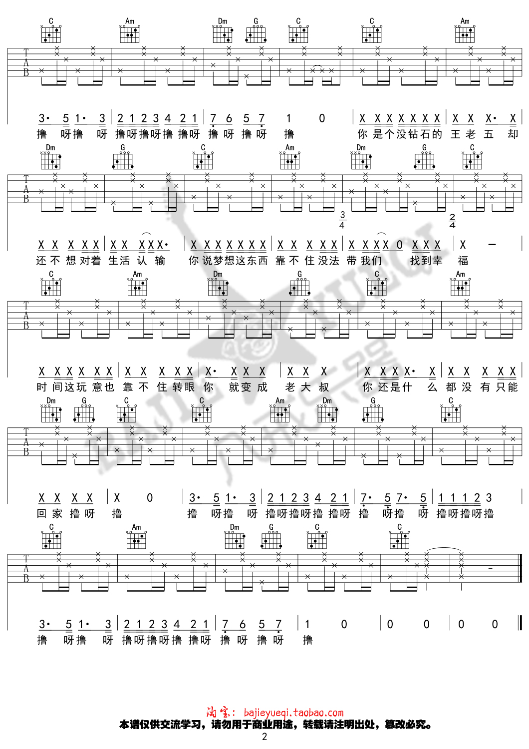 曲谱介绍: 花粥《屌丝之歌》吉他弹唱谱,采用C调指法编配,八戒乐器编配出品,共有2张高清图谱,免翻页排版设计。