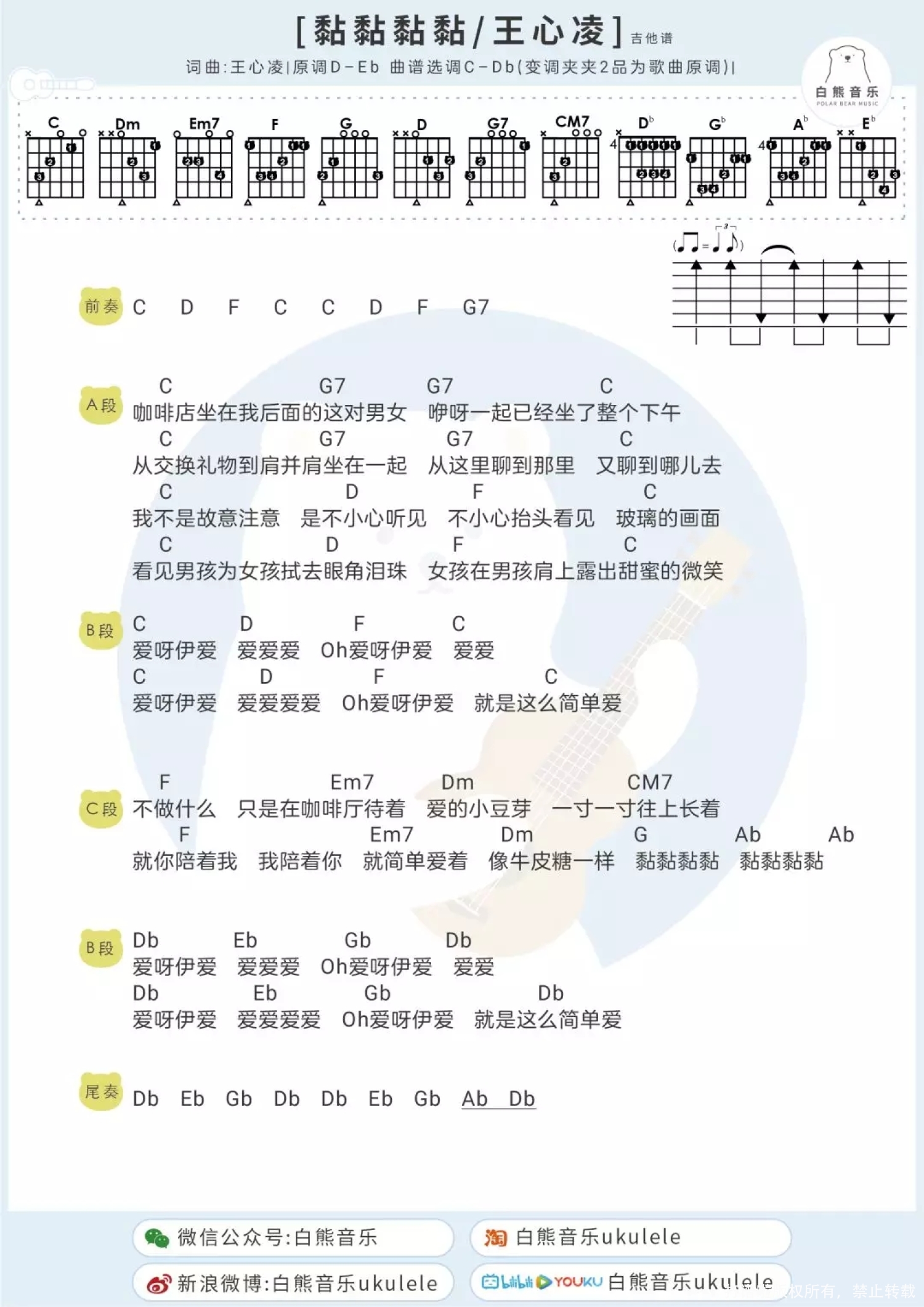 曲谱介绍: 今天小编打开微博发现热搜榜出现这个: 身处广东的小白熊已经热热热热的状态持续好久了! 刚好今天要推荐一首特别夏天特别充满恋爱甜蜜的歌儿~ 来自王心凌作词作曲的「黏黏黏黏」~ 超级俏皮可爱,或许你还没听过哟~ (简直是单身狗的甜蜜暴击><)   黏黏黏黏弹唱演示 尤克里里弹唱|@草帽呀   甜萌的歌曲MV   黏黏黏黏弹唱教学 Ukulele弹唱教学|@草帽呀   「黏黏黏黏」弹唱谱 1、尤克里里弹唱谱   2、吉他弹唱谱