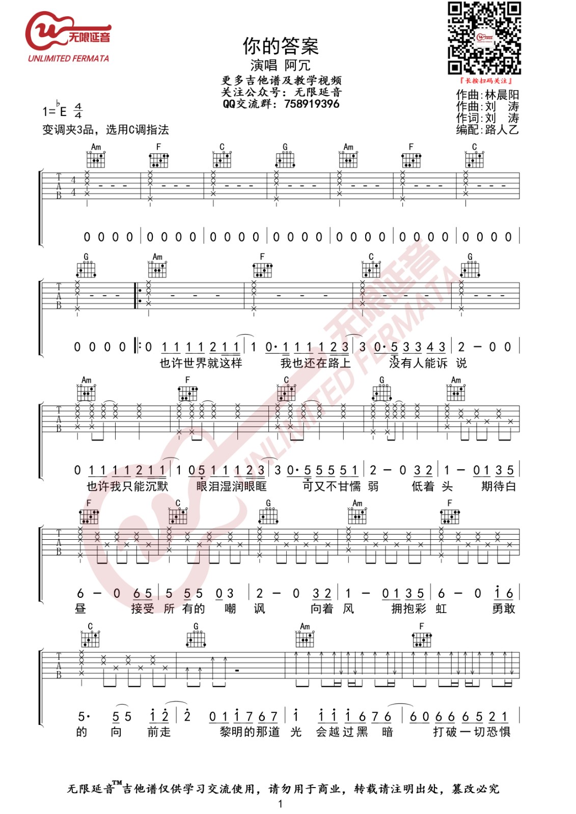曲谱介绍: 阿冗《你的答案》吉他弹唱谱,采用C调指法编配,无限延音编配出品,共有2张高清图谱,免翻页排版设计。