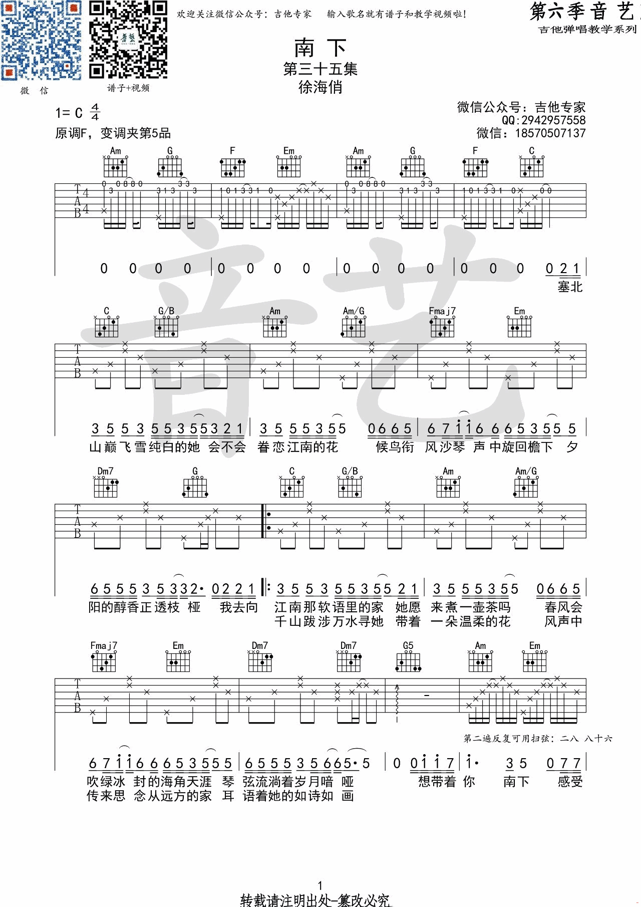 曲谱介绍: 徐海俏《南下》吉他弹唱谱,采用C调指法编配,音艺吉他编配出品,共有2张高清图谱,免翻页排版设计。