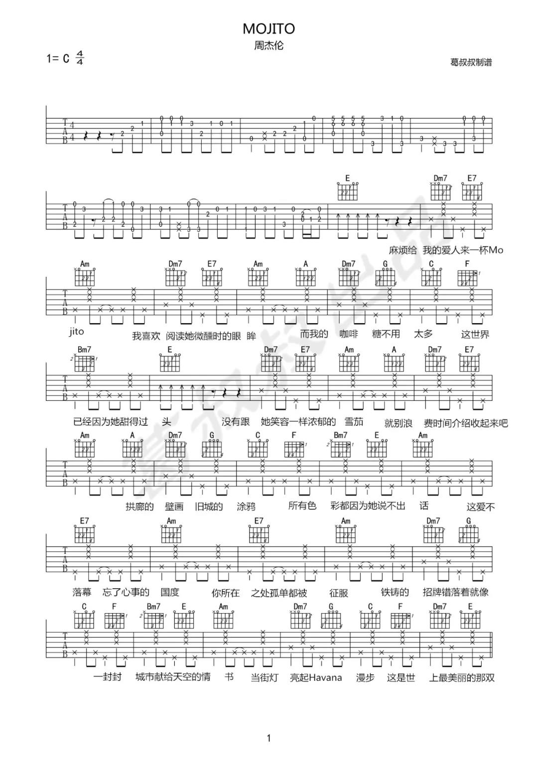 曲谱介绍: 周杰伦新歌《MOJITO》吉他弹唱谱,采用C调指法编配,葛叔叔编配出品,共有3张高清图谱。