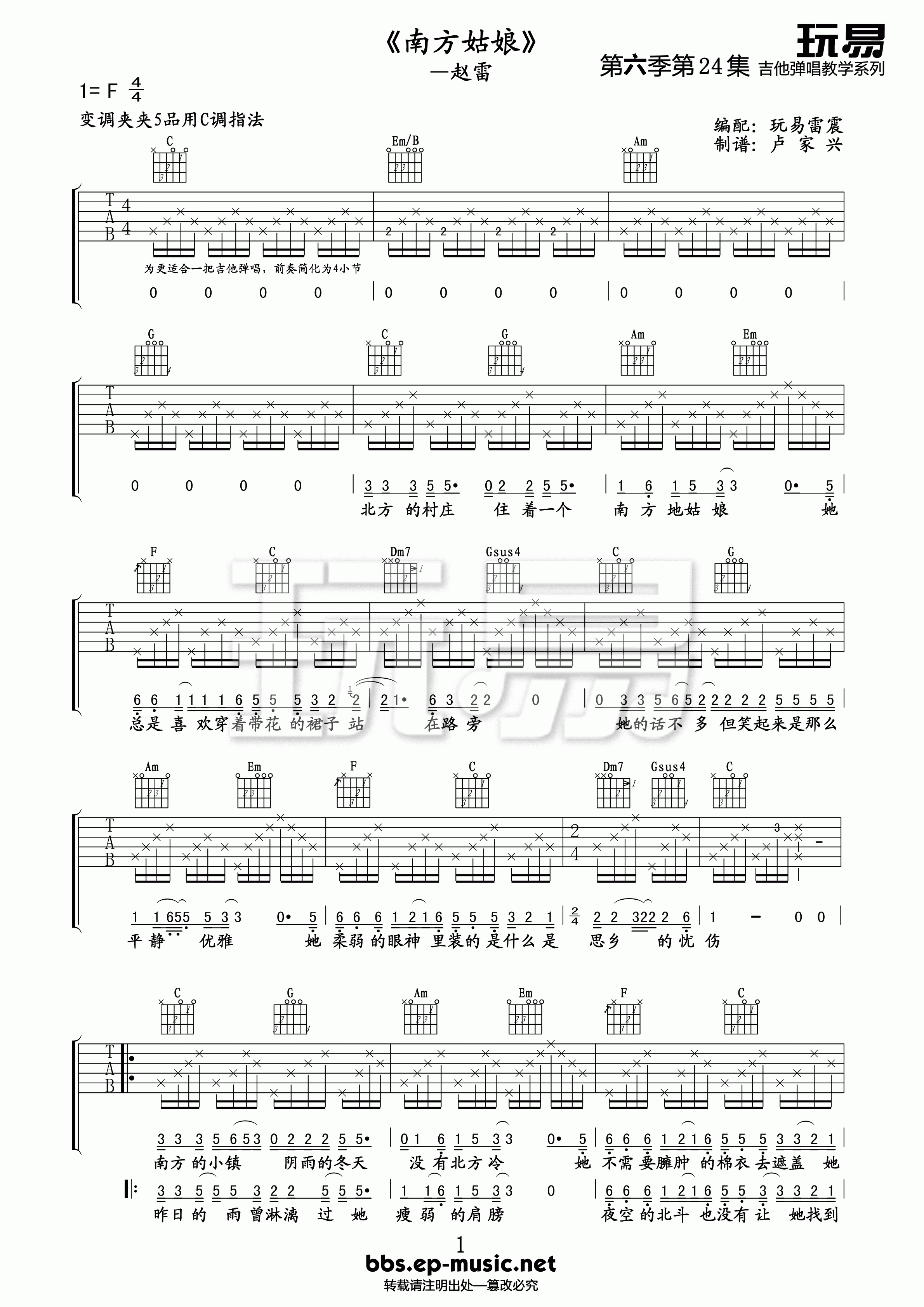 曲谱介绍: 赵雷《南方姑娘》吉他弹唱谱,采用C调指法编配,玩易乐器编配出品,共有3张高清图谱。