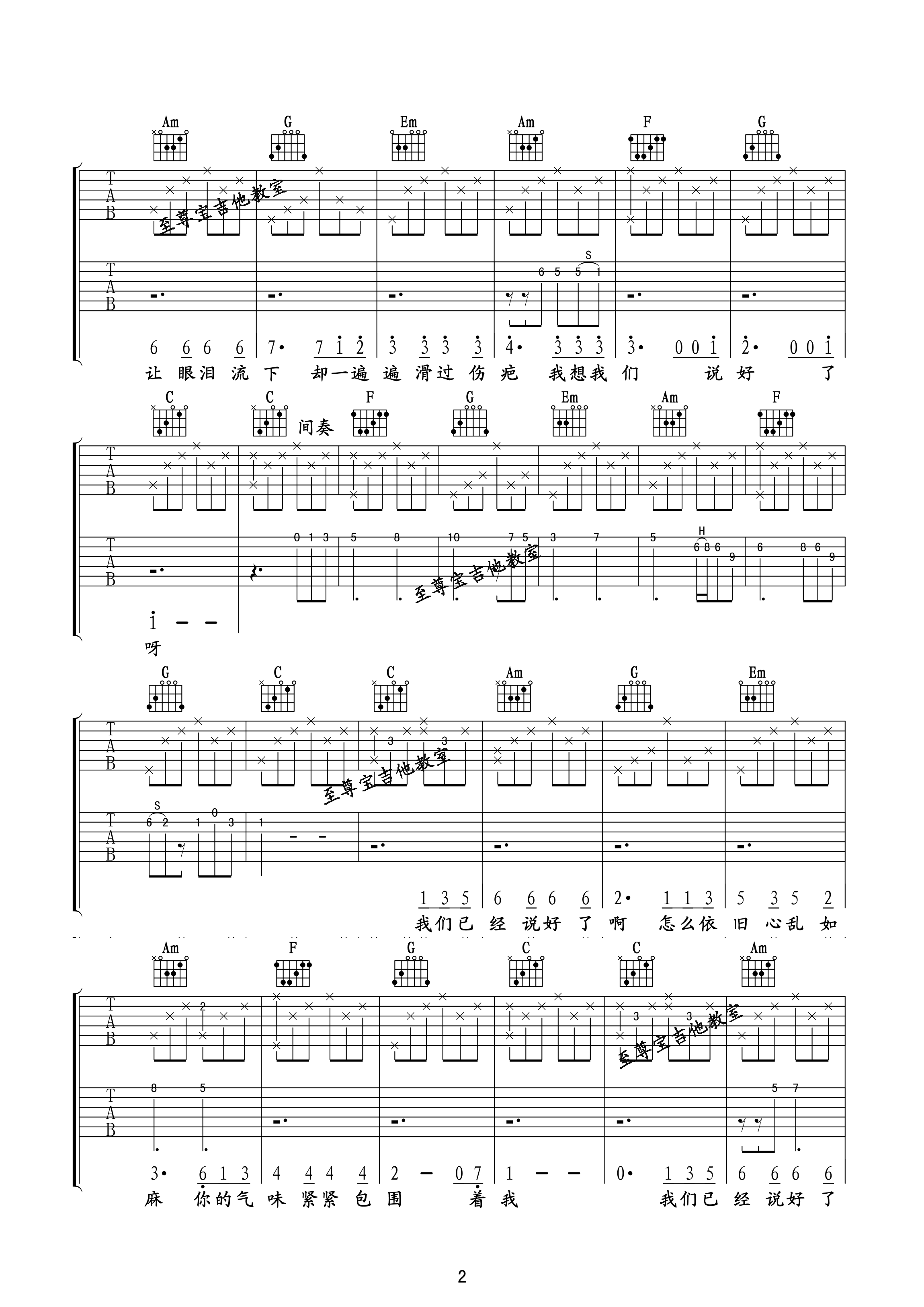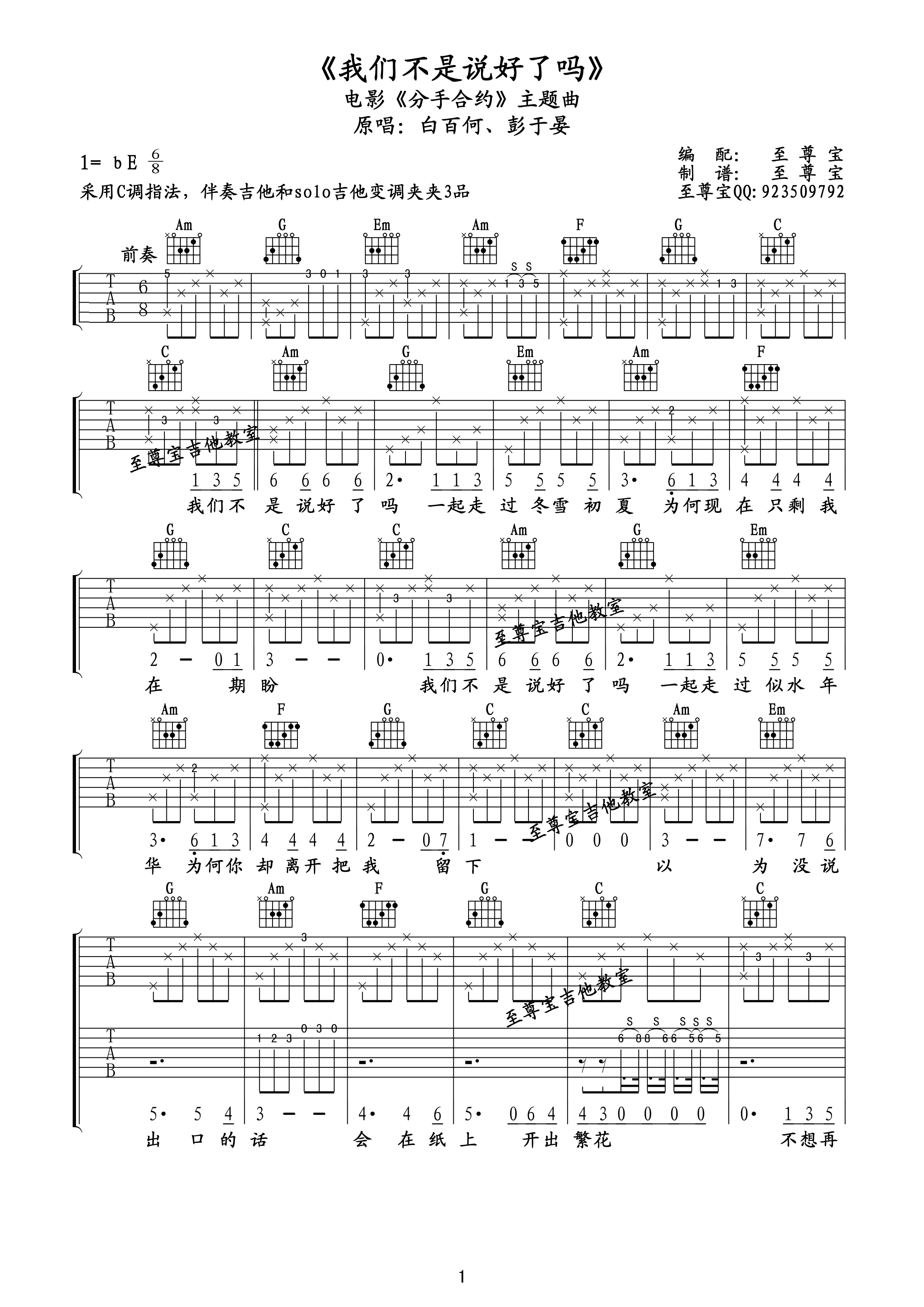 曲谱介绍: 彭于晏《我们不是说好了吗》吉他弹唱谱,采用B调指法编配,至尊宝吉他教室编配出品,共有3张高清图谱。