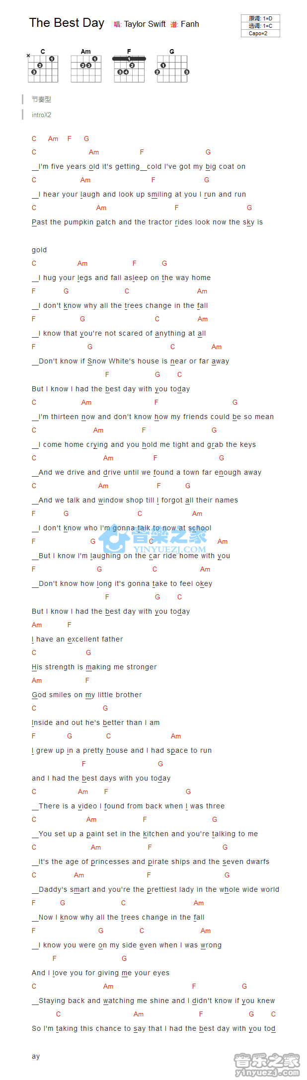 曲谱介绍: The《TheBestDay》吉他弹唱谱,采用C调指法编配,音乐之家编配出品,共有1张高清图谱,免翻页排版设计。
