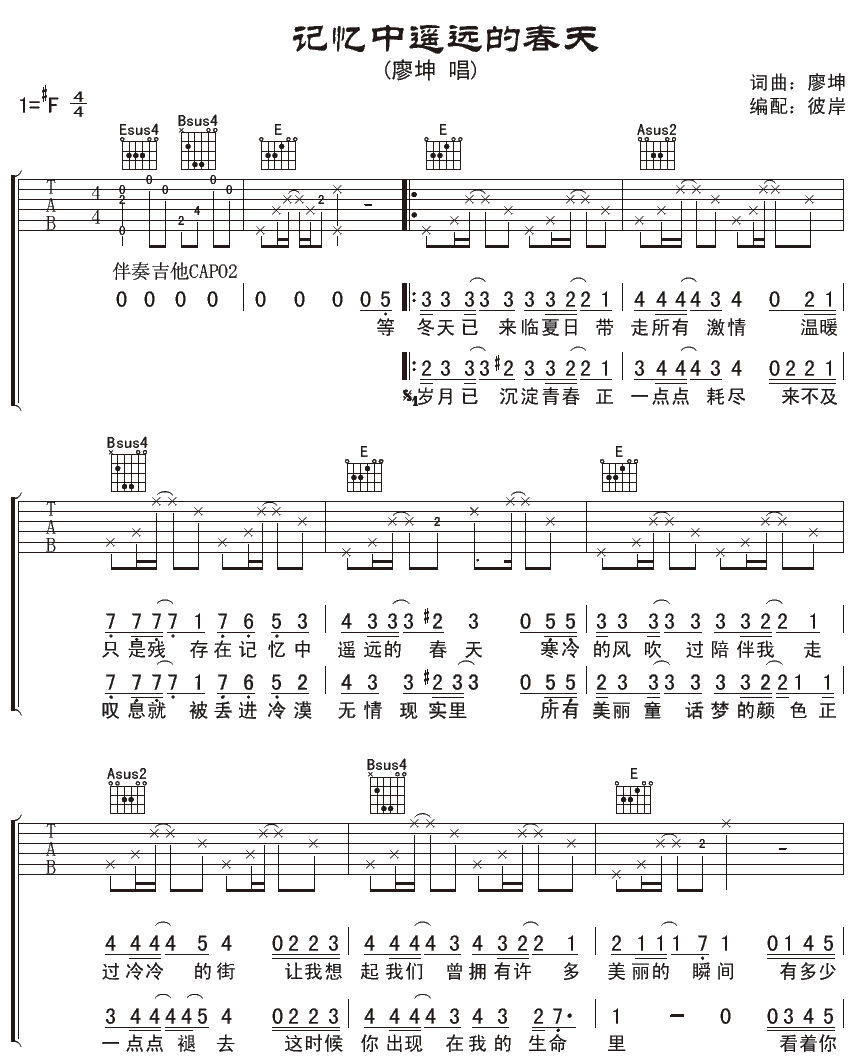 曲谱介绍: 廖坤《记忆中遥远的春天》吉他弹唱谱,采用F调指法编配,彼岸吉他编配出品,共有1张高清图谱,免翻页排版设计。