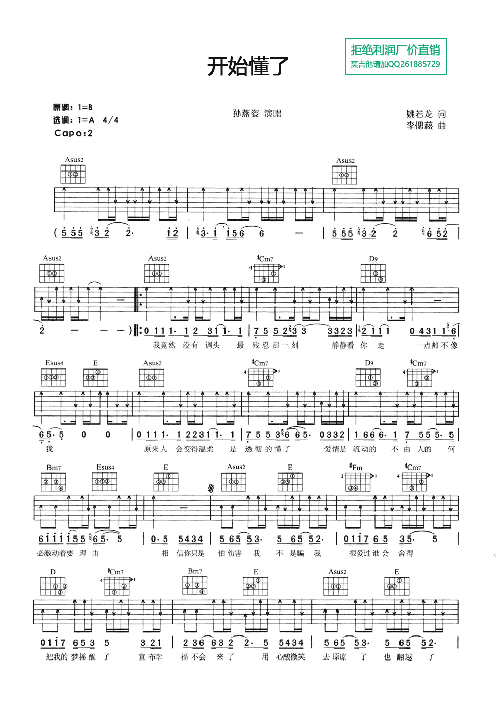 曲谱介绍: 孙燕姿《开始懂了》吉他弹唱谱,采用A调指法编配,共有2张高清图谱,免翻页排版设计。