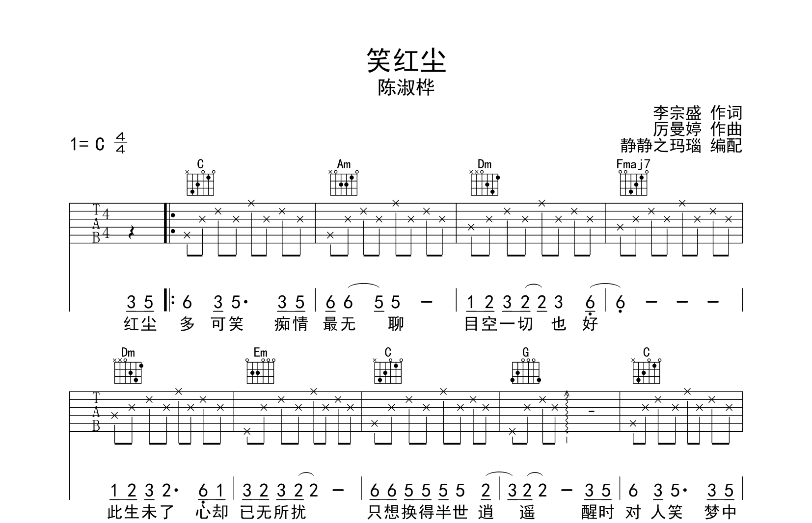 曲谱介绍: 笑红尘吉他谱,陈淑桦演唱的一首经典老歌,笑红尘吉他六线谱,共两张图片谱,本谱采用C调和弦指法编配,节奏为4/4拍,速度为90拍每分钟,弹唱建议不夹变调夹,难度初级,由@静静之玛瑙制谱。