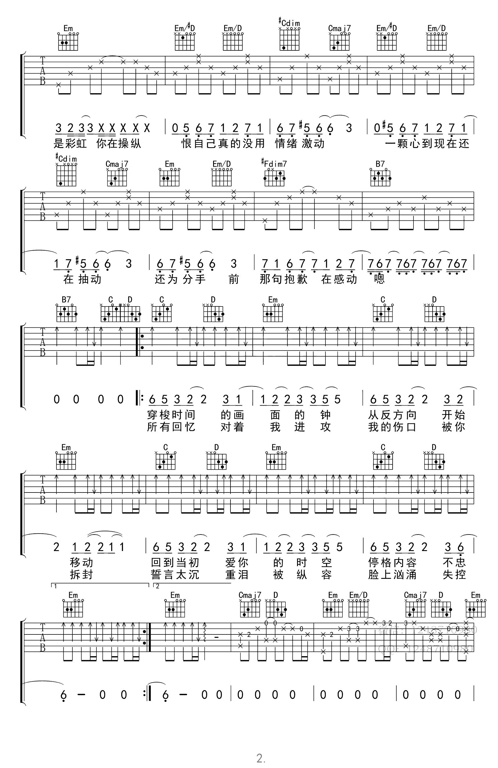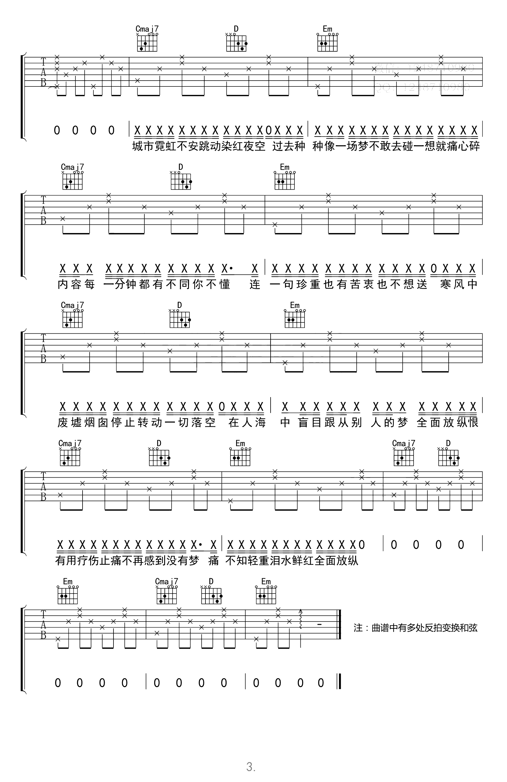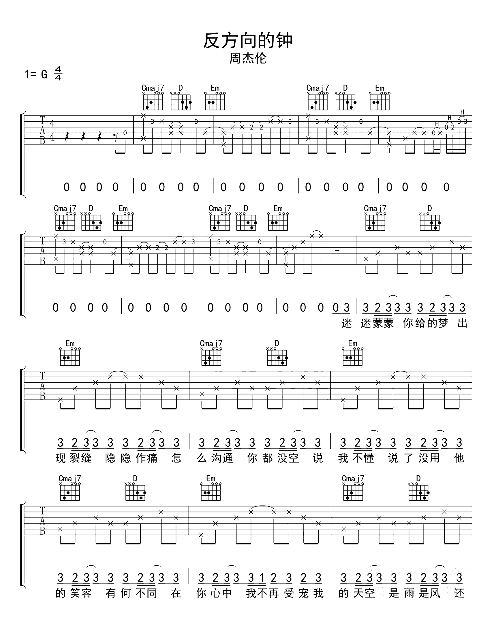 曲谱介绍: 《反方向的钟》吉他弹唱谱,G调指法编配,三张高清图片六线谱。