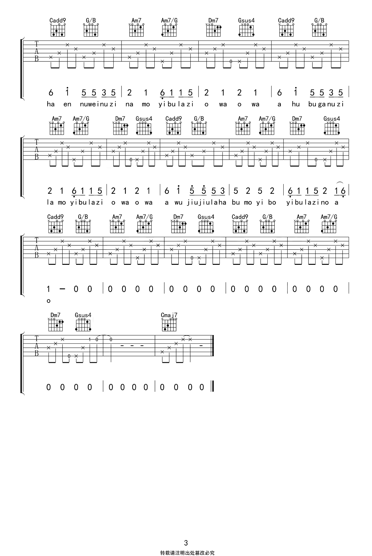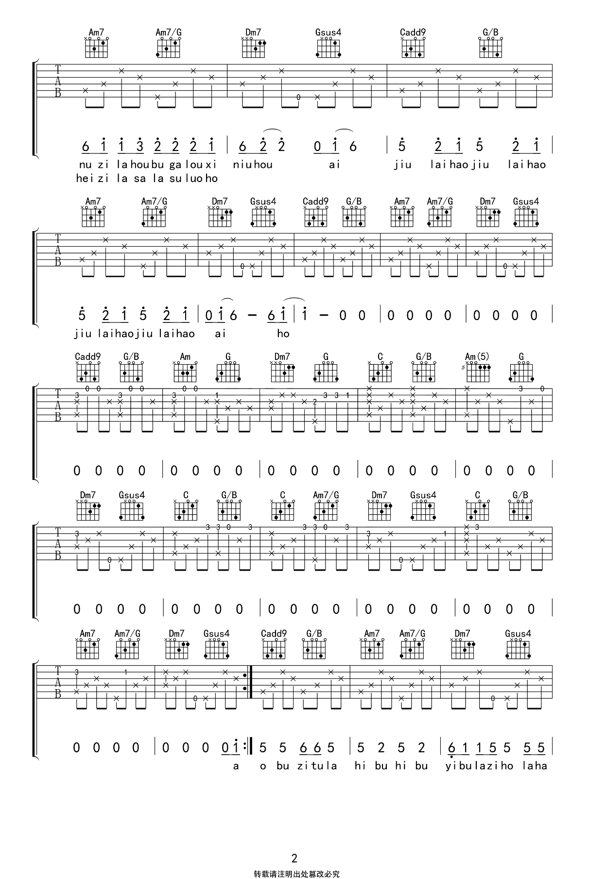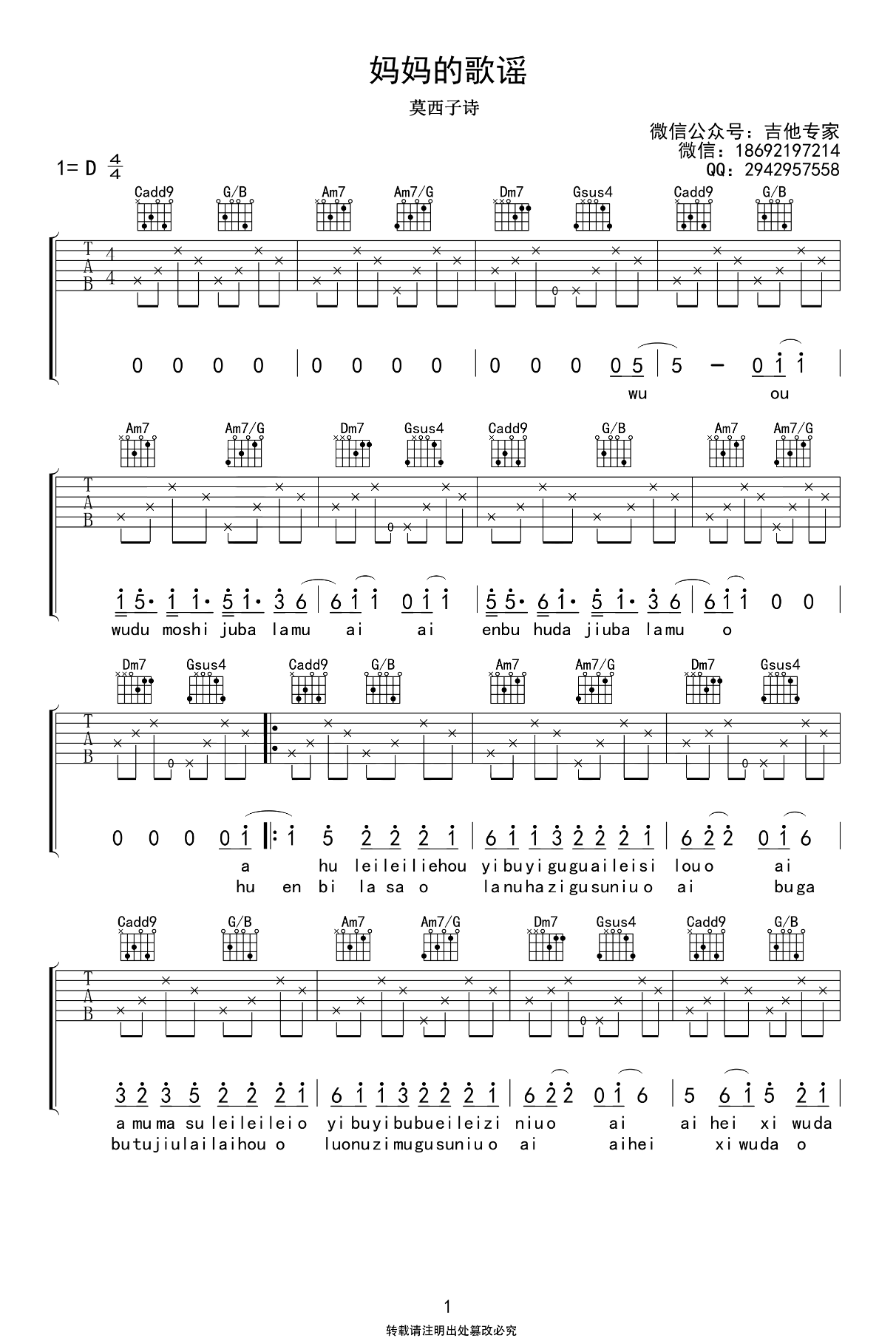 曲谱介绍: 原生态的音乐总是更能打动我们,《妈妈的歌谣》吉他弹唱谱,选用D调原版编配,六线谱共三张图片。
