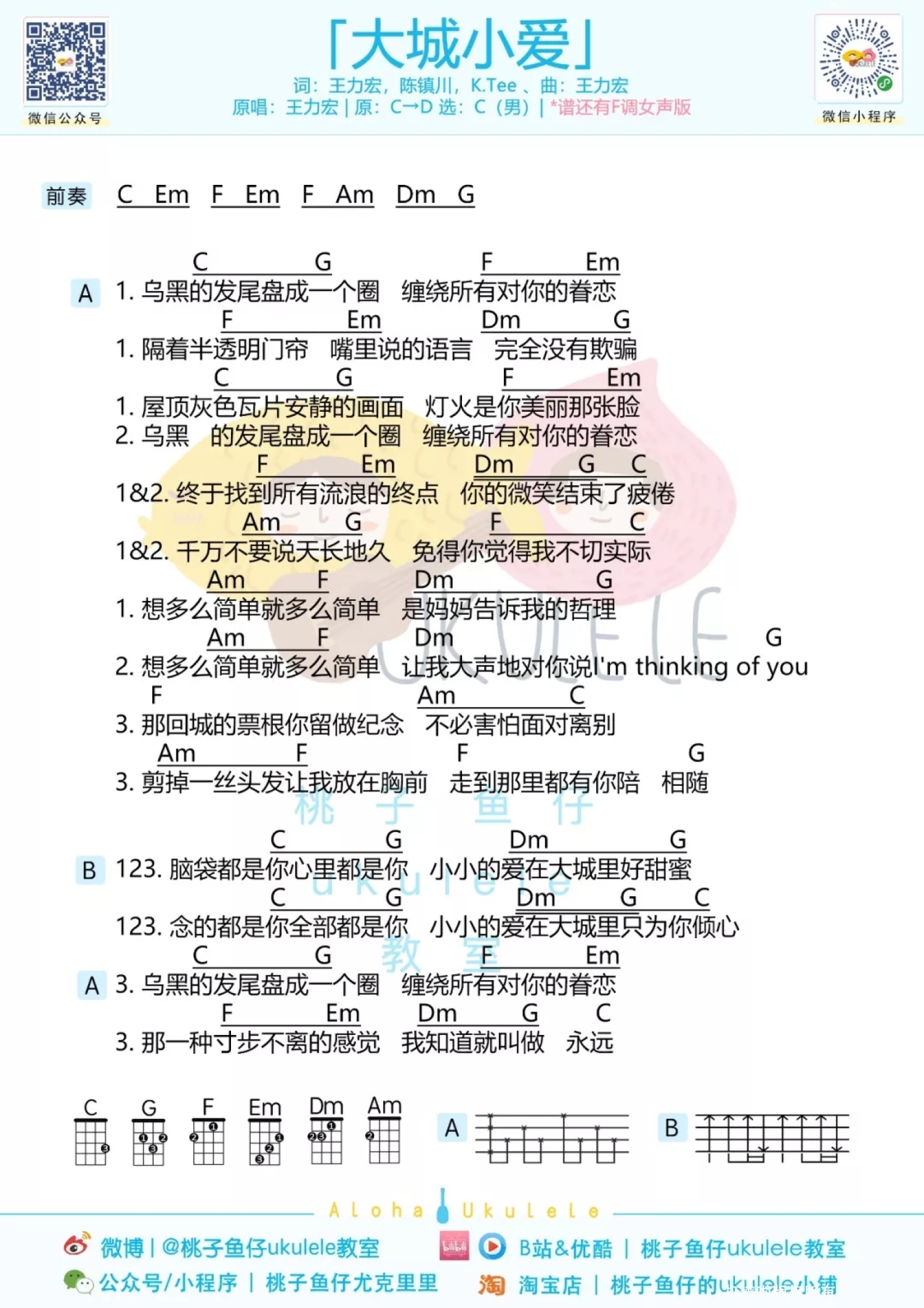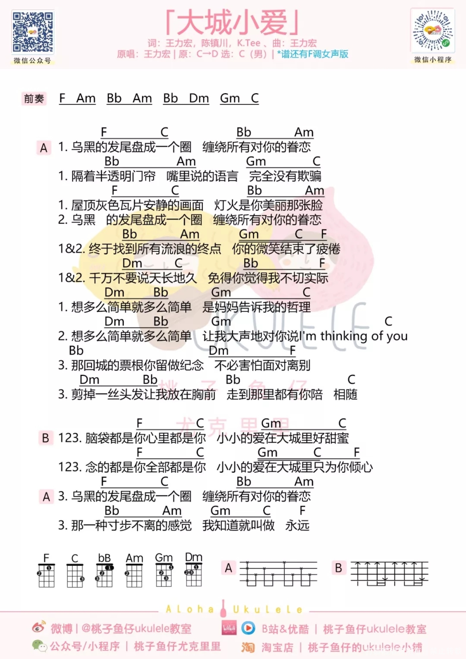 曲谱介绍: 提起王力宏, 首先想到他的《大城小爱》, 这首歌就像他的人, 干净、热情, 在懵懂无知的青葱岁月, 带给我们无数次小鹿乱撞~   「大城小爱」弹唱谱 1、女声版     2、男声版