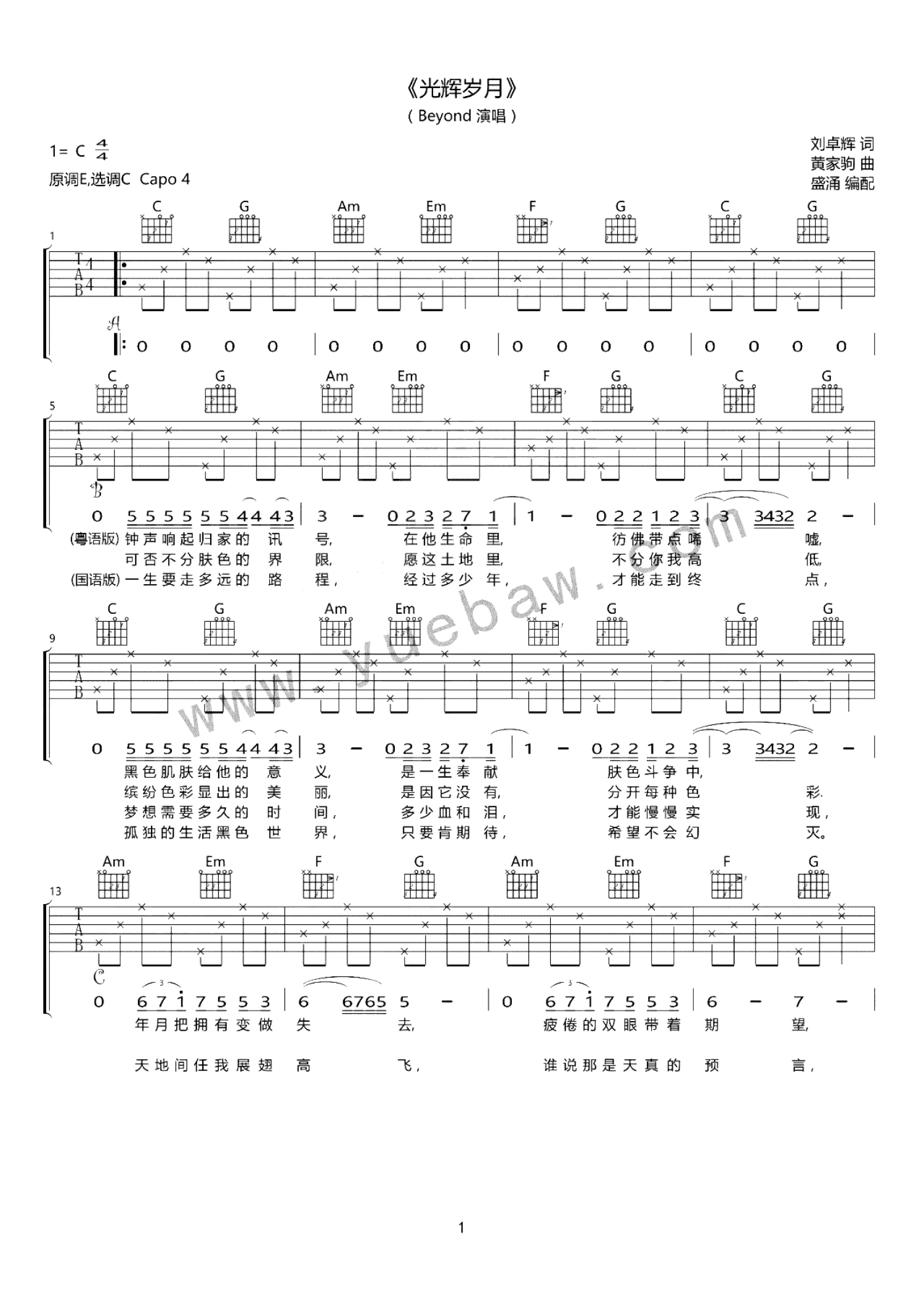 曲谱介绍: 光辉岁月吉他谱,Beyond的一首经典歌曲,光辉岁月六线谱,原调E,选调C,变调夹夹四品。