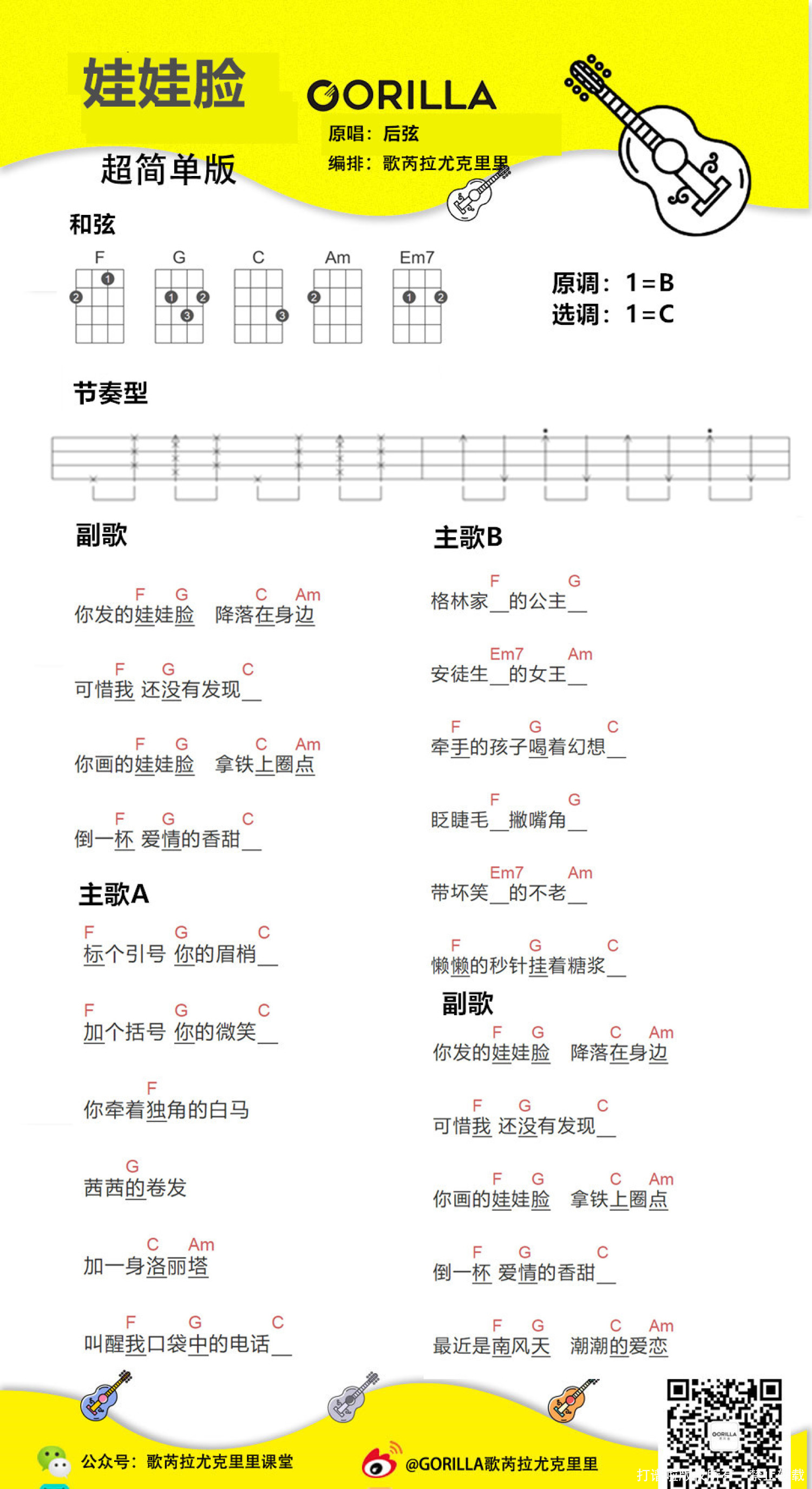 曲谱介绍: 《娃娃脸》是后弦在2009年发行的一首歌,整首歌由后弦作词、作曲并演唱,近期这首歌再度在很多短视频app走红,成为人气居高不下的热门金曲。喜欢这首歌的人,果然都很怀旧! 下面给大家具体讲解一下这首歌用尤克里里如何弹唱~ 下面附上这首歌的完整曲谱~